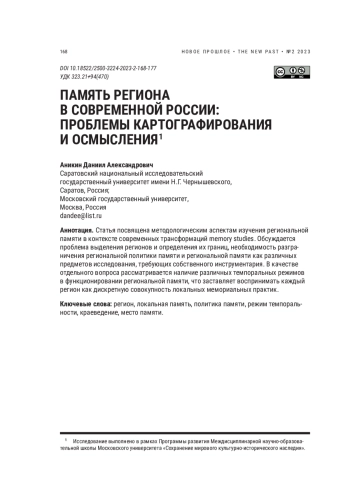 Статья посвящена методологическим аспектам изучения региональной памяти в контексте современных трансформаций memory studies. Обсуждается проблема выделения регионов и определения их границ, необходимость разграничения региональной политики памяти и региональной памяти как различных предметов исследования, требующих собственного инструментария. В качестве отдельного вопроса рассматривается наличие различных темпоральных режимов в функционировании региональной памяти, что заставляет воспринимать каждый регион как дискретную совокупность локальных мемориальных практик.