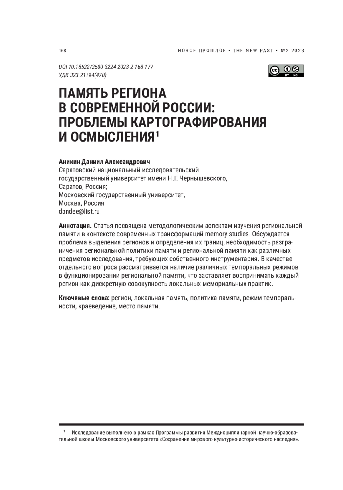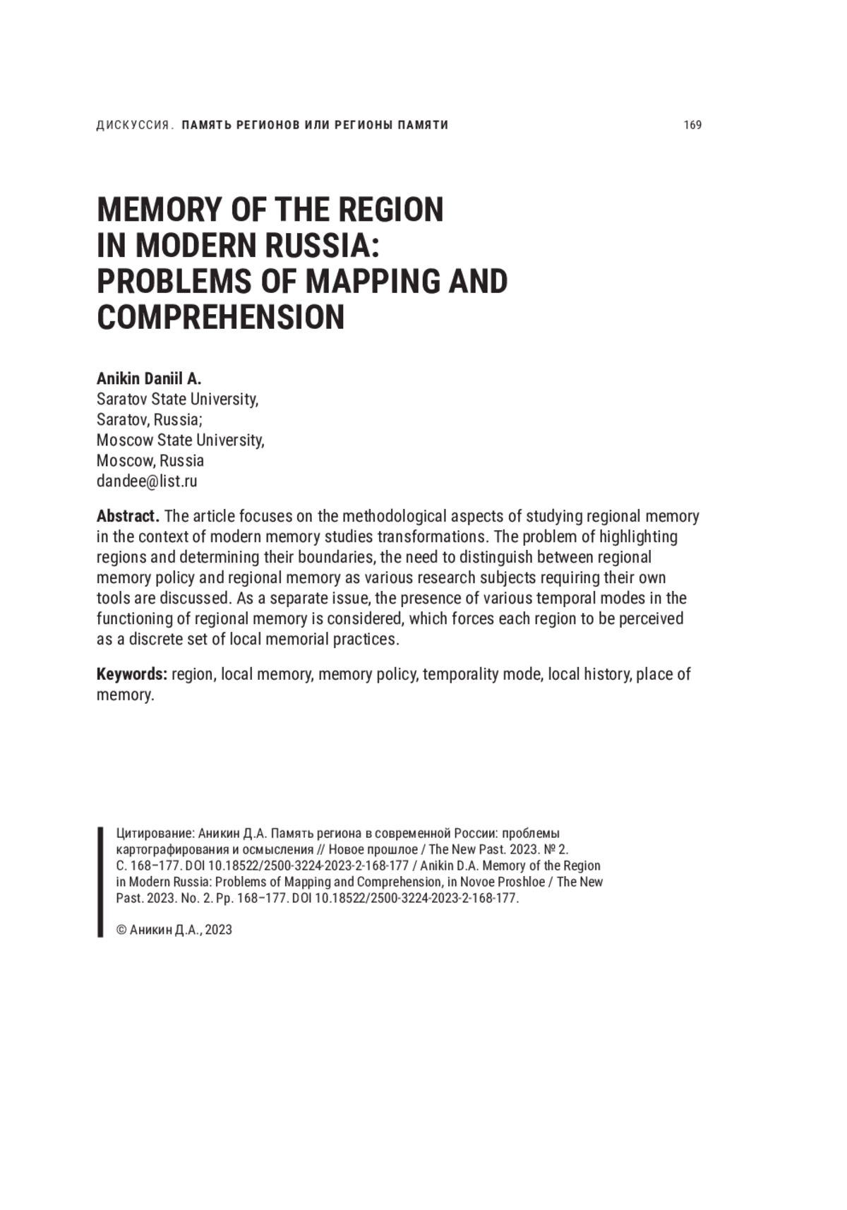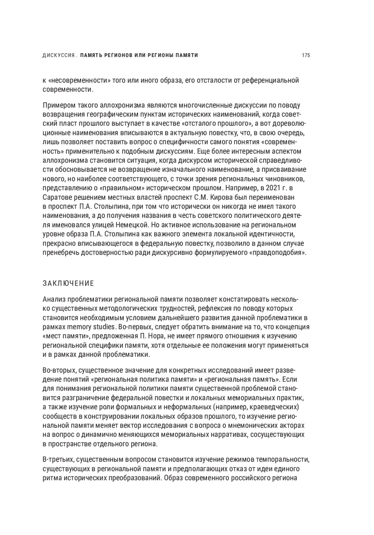 Обращение к региональной памяти как отдельному пласту образов прошлого представляется вполне закономерным в контексте развития и предметного самоопределения memory studies. Речь при этом не идет об изменении самого предмета исследования, а, скорее, об уточнении внутренней структуры памяти, понимании сложности и нелинейности этого явления.