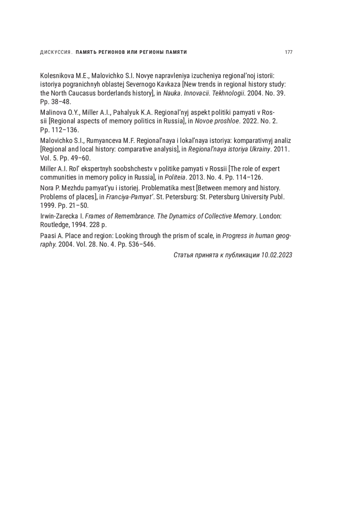 4. Малинова О.Ю., Миллер А.И., Пахалюк К.А. Региональный аспект политики памяти в России // Новое прошлое. 2022. № 2. С. 112-136. EDN: PLMFQB