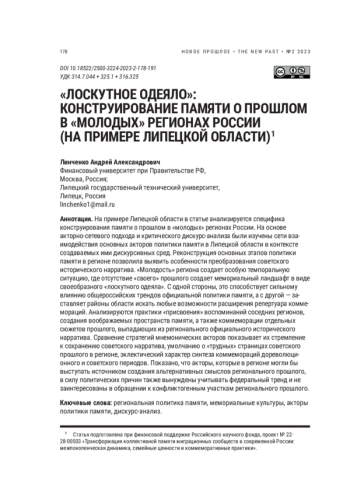 На примере Липецкой области в статье анализируется специфика конструирования памяти о прошлом в «молодых» регионах России. На основе акторно-сетевого подхода и критического дискурс-анализа были изучены сети взаимодействия основных акторов политики памяти в Липецкой области в контексте создаваемых ими дискурсивных сред. Реконструкция основных этапов политики памяти в регионе позволила выявить особенности преобразования советского исторического нарратива. «Молодость» региона создает особую темпоральную ситуацию, где отсутствие «своего» прошлого создает мемориальный ландшафт в виде своеобразного «лоскутного одеяла». C одной стороны, это способствует сильному влиянию общероссийских трендов официальной политики памяти, а с другой — заставляет районы области искать любые возможности расширения репертуара коммемораций. Анализируются практики «присвоения» воспоминаний соседних регионов, создания воображаемых пространств памяти, а также коммеморации отдельных сюжетов прошлого, выпадающих из регионального официального исторического нарратива. Сравнение стратегий мнемонических акторов показывает их стремление к сохранению советского нарратива, умолчанию о «трудных» страницах советского прошлого в регионе, эклектический характер синтеза коммемораций дореволюционного и советского периодов. Показано, что акторы, которые в регионе могли бы выступать источником создания альтернативных смыслов регионального прошлого, в силу политических причин также вынуждены учитывать федеральный тренд и не заинтересованы в обращении к конфликтогенным участкам регионального прошлого.