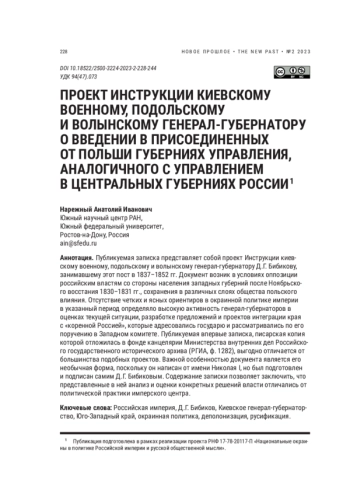 Публикуемая записка представляет собой проект Инструкции киевскому военному, подольскому и волынскому генерал-губернатору Д. Г. Бибикову, занимавшему этот пост в 1837–1852 гг. Документ возник в условиях оппозиции российским властям со стороны населения западных губерний после Ноябрьского восстания 1830–1831 гг., сохранения в различных слоях общества польского влияния. Отсутствие четких и ясных ориентиров в окраинной политике империи в указанный период определяло высокую активность генерал-губернаторов в оценках текущей ситуации, разработке предложений и проектов интеграции края с «коренной Россией», которые адресовались государю и рассматривались по его поручению в Западном комитете. Публикуемая впервые записка, писарская копия которой отложилась в фонде канцелярии Министерства внутренних дел Российского государственного исторического архива (РГИА, ф. 1282), выгодно отличается от большинства подобных проектов. Важной особенностью документа является его необычная форма, поскольку он написан от имени Николая I, но был подготовлен и подписан самим Д. Г. Бибиковым. Содержание записки позволяет заключить, что представленные в ней анализ и оценки конкретных решений власти отличались от политической практики имперского центра