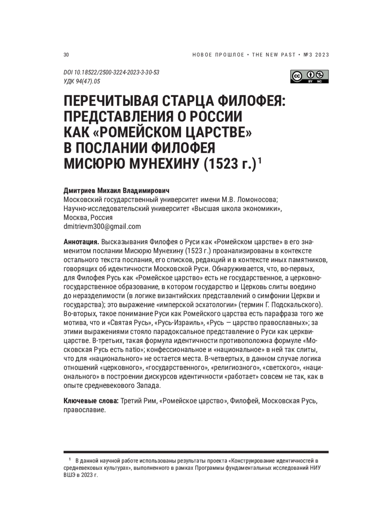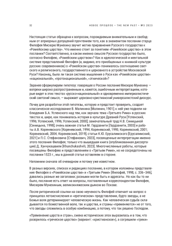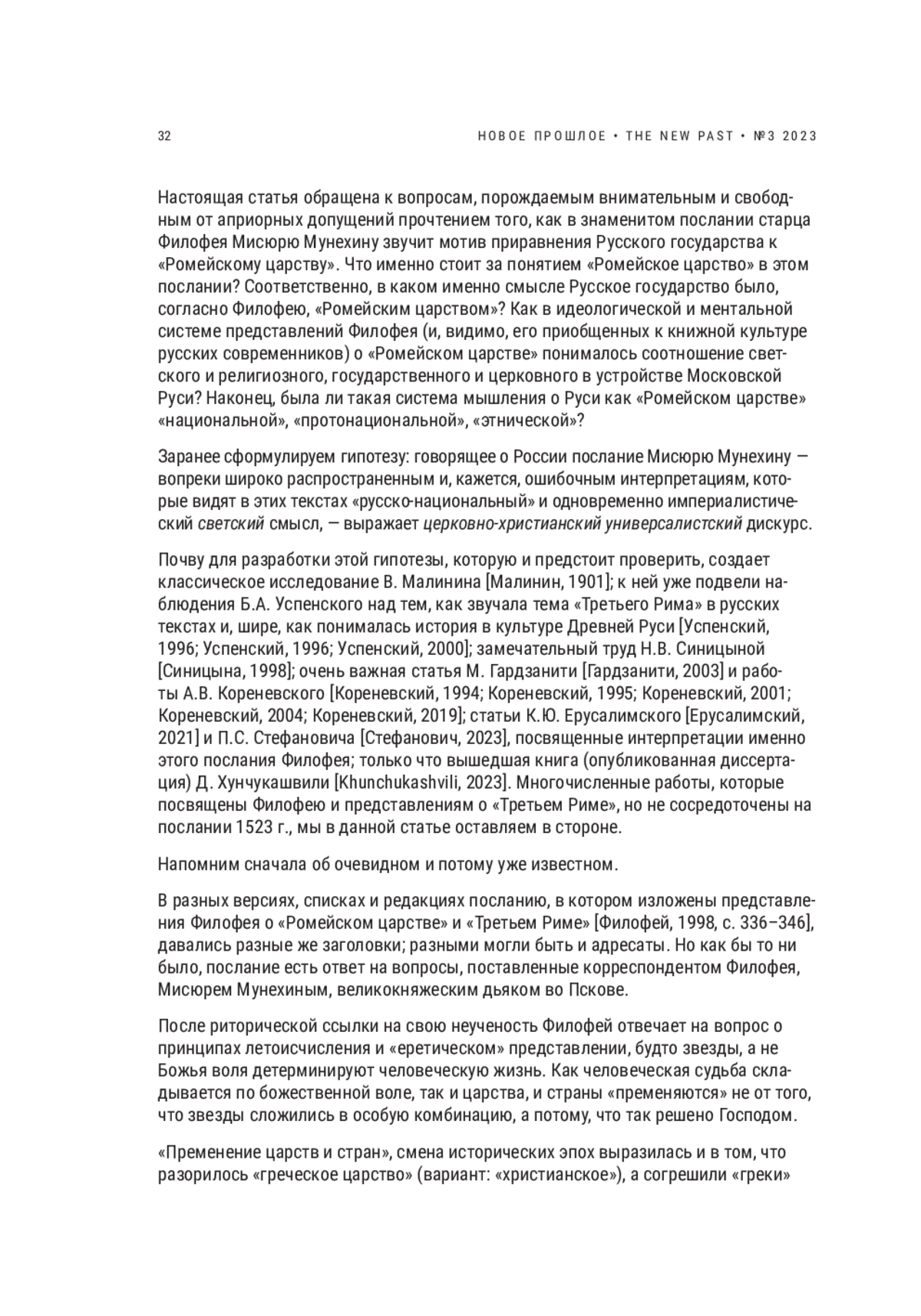Настоящая статья обращена к вопросам, порождаемым внимательным и свободным от априорных допущений прочтением того, как в знаменитом послании старца Филофея Мисюрю Мунехину звучит мотив приравнения Русского государства к «Ромейскому царству». Что именно стоит за понятием «Ромейское царство» в этом послании? Соответственно, в каком именно смысле Русское государство было, согласно Филофею, «Ромейским царством»? Как в идеологической и ментальной системе представлений Филофея (и, видимо, его приобщенных к книжной культуре русских современников) о «Ромейском царстве» понималось соотношение светского и религиозного, государственного и церковного в устройстве Московской Руси? Наконец, была ли такая система мышления о Руси как «Ромейском царстве» «национальной», «протонациональной», «этнической»?