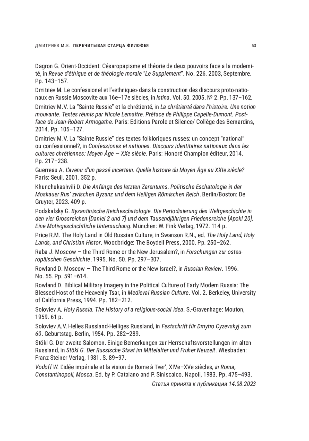 51. Dmitriev M. Le confessionel et l’“ethnique” dans la construction des discours proto-nationaux en Russie Moscovite aux XVIe-XVIIe siècles // Istina. Vol. 50 (2005). № 2. Рp. 137-162.