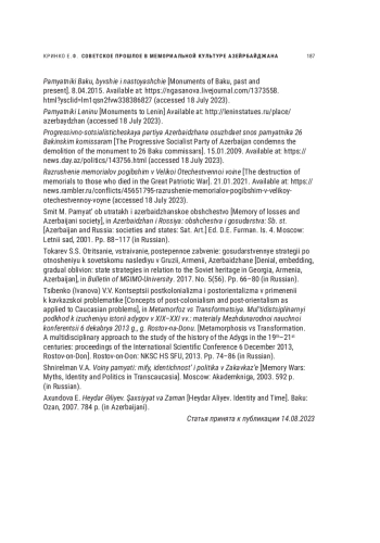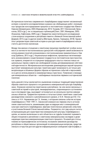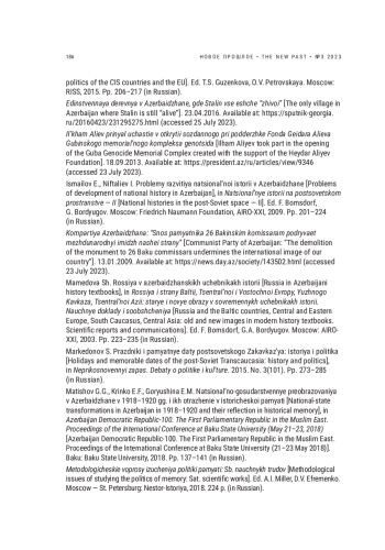 Историческая политика современного Азербайджана представляет несомненный интерес и изучается исследователями в рамках как обобщающих работ, посвященных процессам конструирования прошлого в постсоветских государствах Южного Кавказа [Шнирельман, 2003; Маркедонов, 2015; Токарев, 2017; Волхонский, Ярлыкапов, 2023 и др.], так и специальных публикаций [Смит, 2001; Мамедова, 2003; Исмаилов, Нифталиев, 2009 и др.]. Предметом самостоятельного исследования стали вопросы сохранения в республике памяти о Великой Отечественной войне [Дарвай, 2015 и др.] и другие сюжеты [Матишов, Кринко, Горюшина, 2018]. Однако опыт репрезентации советской истории в культуре памяти Азербайджана нельзя считать достаточно изученным.