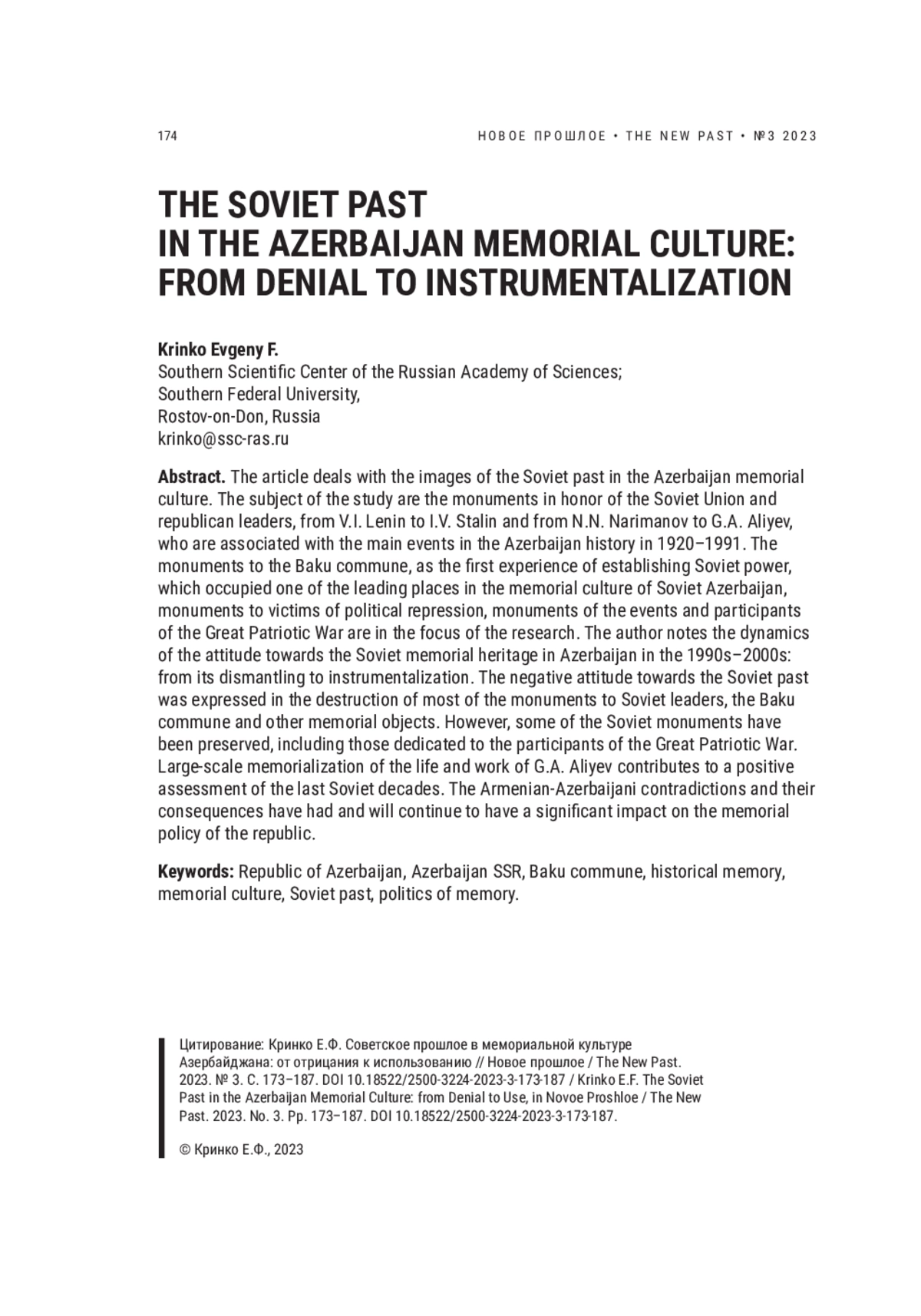Статья посвящена образам советского прошлого в мемориальной культуре Азербайджана. Предметом изучения выступают памятники: советским союзным и республиканским руководителям, от В. И. Ленина до И. В. Сталина и от Н. Н. Нариманова до Г. А. Алиева, с которыми связаны основные события истории Азербайджана в 1920–1991 гг.; Бакинской коммуне как первому опыту установления советской власти, занимавшему одно из ведущих мест в мемориальной культуре советского Азербайджана; жертвам политических репрессий; событиям и участникам Великой Отечественной войны. Автор отмечает динамику отношения к советскому мемориальному наследию в Азербайджане в 1990–2000-х гг. от демонтажа к инструментализации. Негативное отношение к советскому прошлому выражалось в разрушении большинства памятников советским вождям, Бакинской коммуне и других мемориальных объектов. Однако часть советских памятников сохранилась, в том числе посвященных участникам Великой Отечественной войны. Широкомасштабная мемориализация жизни и деятельности Г. А. Алиева способствует положительной оценке последних советских десятилетий. Значительное влияние на мемориальную политику республики оказали и будут в дальнейшем оказывать армяно-азербайджанские противоречия и их последствия