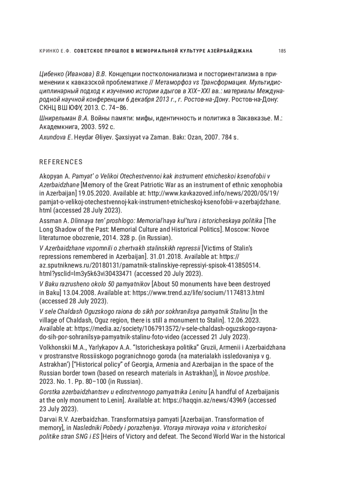 1. Акопян А. Память о Великой Отечественной как инструмент этнической ксенофобии в Азербайджане. 19.05.2020. URL: http://www.kavkazoved.info/news/2020/05/19/pamjat-o-velikoj-otechestvennoj-kak-instrument-etnicheskoj-ksenofobii-v-azerbajdzhane.html (дата обращения - 23 июля 2023 г.).