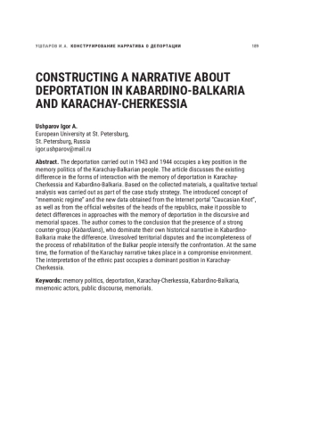 Депортация, осуществленная в 1943 и 1944 гг., занимает ключевую позицию в политике памяти карачаево-балкарского народа. В статье рассматривается существующая разница в формах взаимодействия с памятью о депортации в Карачаево-Черкесии и Кабардино-Балкарии. На основании собранных материалов был проведен качественный текстуальный анализ в рамках стратегии кейс-стади. Введенный концепт «режим памяти» и полученные новые данные с интернет-портала «Кавказский Узел», а также с официальных сайтов глав республик позволяют обнаружить различия в подходах к работе с памятью о депортации в дискурсивном и мемориальном пространствах. Автор приходит к выводу, что разница связана с наличием сильной контгруппы (кабардинцев), которая претендует на доминирование собственного исторического нарратива в Кабардино-Балкарии. Неразрешенные территориальные споры и незавершенность процесса реабилитации балкарского народа усиливают конфронтацию памяти. В тоже время формирование карачаевского нарратива происходит в компромиссной среде, а интерпретация этнического прошлого занимает доминирующие позиции в Карачаево-Черкесии