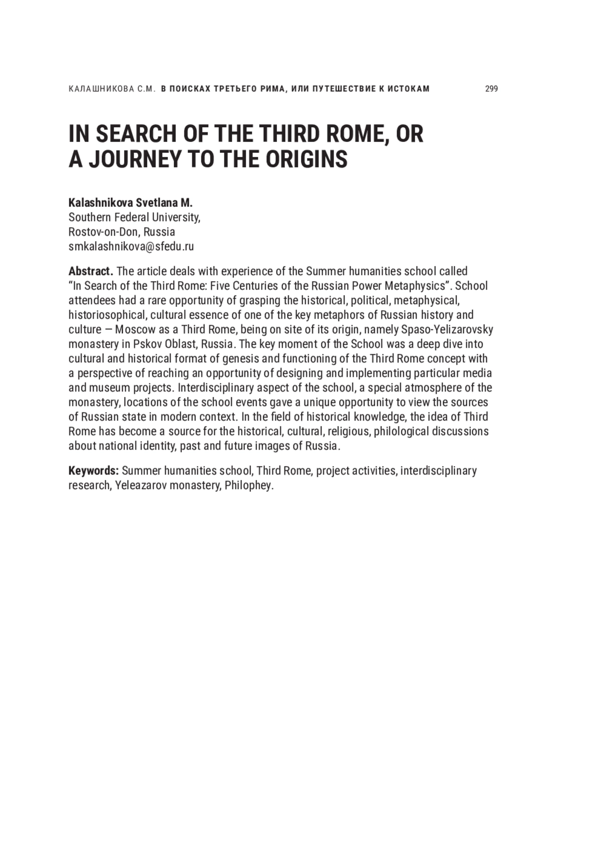 КАЛАШНИКОВА С. М. В ПОИСКАХ ТРЕТЬЕГО РИМА, ИЛИ ПУТЕШЕСТВИЕ К ИСТОКАМ // НОВОЕ ПРОШЛОЕ. 2023. № 3