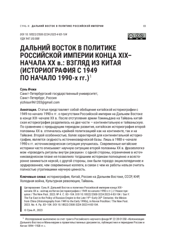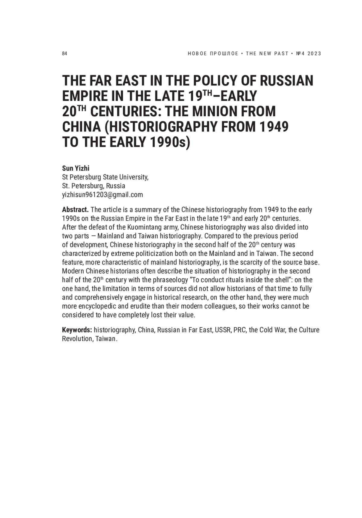 Статья представляет собой обобщение китайской историографии с 1949 по начало 1990-х гг. о присутствии Российской империи на Дальнем Востоке в конце XIX–начале XX в. После отступления армии Гоминьдана на Тайвань китайская историография разделилась на две части — континентальную и тайваньскую. По сравнению с предыдущим периодом развития, китайская историография второй половины XX в. отличалась крайней политизацией как на континенте, так и на Тайване. Второй особенностью, более характерной для континентальной историографии, является скудность источниковедческой базы. Лишь в 1980-х–начале 1990-х гг. источниковедческая ситуация улучшилась. Современные китайские историки часто описывают научную ситуацию второй половины XX в. фразеологизмом «проводить ритуалы внутри ракушки»: с одной стороны, ограничение в источниковедческом плане не позволило тогдашним историкам полноценно и всесторонне заниматься наукой, с другой стороны, они были гораздо энциклопедичнее и эрудированнее, чем современные коллеги, в связи с чем их работы нельзя считать полностью утратившими научную ценность