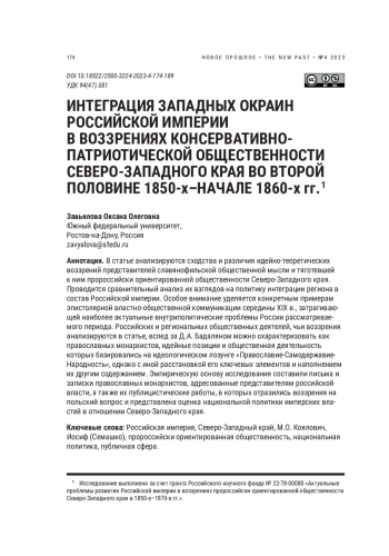 В статье анализируются сходства и различия идейно-теоретических воззрений представителей славянофильской общественной мысли и тяготевшей к ним пророссийски ориентированной общественности Северо-Западного края. Проводится сравнительный анализ их взглядов на политику интеграции региона в состав Российской империи. Особое внимание уделяется конкретным примерам эпистолярной властно-общественной коммуникации середины XIX в., затрагивающей наиболее актуальные внутриполитические проблемы России рассматриваемого периода. Российских и региональных общественных деятелей, чьи воззрения анализируются в статье, вслед за Д. А. Бадаляном можно охарактеризовать как православных монархистов, идейные позиции и общественная деятельность которых базировались на идеологическом лозунге «Православие-СамодержавиеНародность», однако с иной расстановкой его ключевых элементов и наполнением их другим содержанием. Эмпирическую основу исследования составили письма и записки православных монархистов, адресованные представителям российской власти, а также их публицистические работы, в которых отразились воззрения на польский вопрос и представлена оценка национальной политики имперских властей в отношении Северо-Западного края.