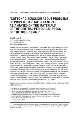 В статье рассмотрена публицистическая дискуссия по хлопковому вопросу, проходившая на страницах периодической печати России в 1880–1890-е гг. Цель статьи — анализ круга проблем и их решений в сфере частного хлопководства в Средней Азии, которые поднимались в публикациях периодических изданий Санкт-Петербурга и Москвы, но оставались при этом на периферии внимания исследователей. В качестве источника использованы статьи в журналах «Русский Вестник», «Вестник Европы», газетах «Московские ведомости», «Новое время», «Голос», «Санкт-Петербургские ведомости», «Правительственный вестник», «Торговопромышленная газета». Автор обозначил основные вопросы развития среднеазиатского хлопководства и участия в нем частного капитала, которые обсуждались в ходе «хлопковой» дискуссии в печати. Среди них проблемы кредитования частных предпринимателей, создания и развития крупных хлопковых плантаций, введения и ограничения хлопковой пошлины, борьбы с «хлопковой лихорадкой», организации сельскохозяйственных выставок и роли иностранного капитала. Автор приходит к заключению, что многообразие проблем и их решений сводилось к одному выводу: усиление частного капитала в хлопководстве необходимо, поскольку это является основой благополучия текстильной промышленности России, а значит, и ее благосостояния в целом