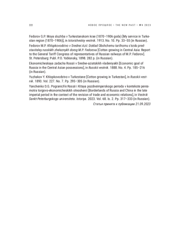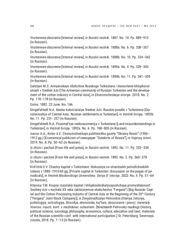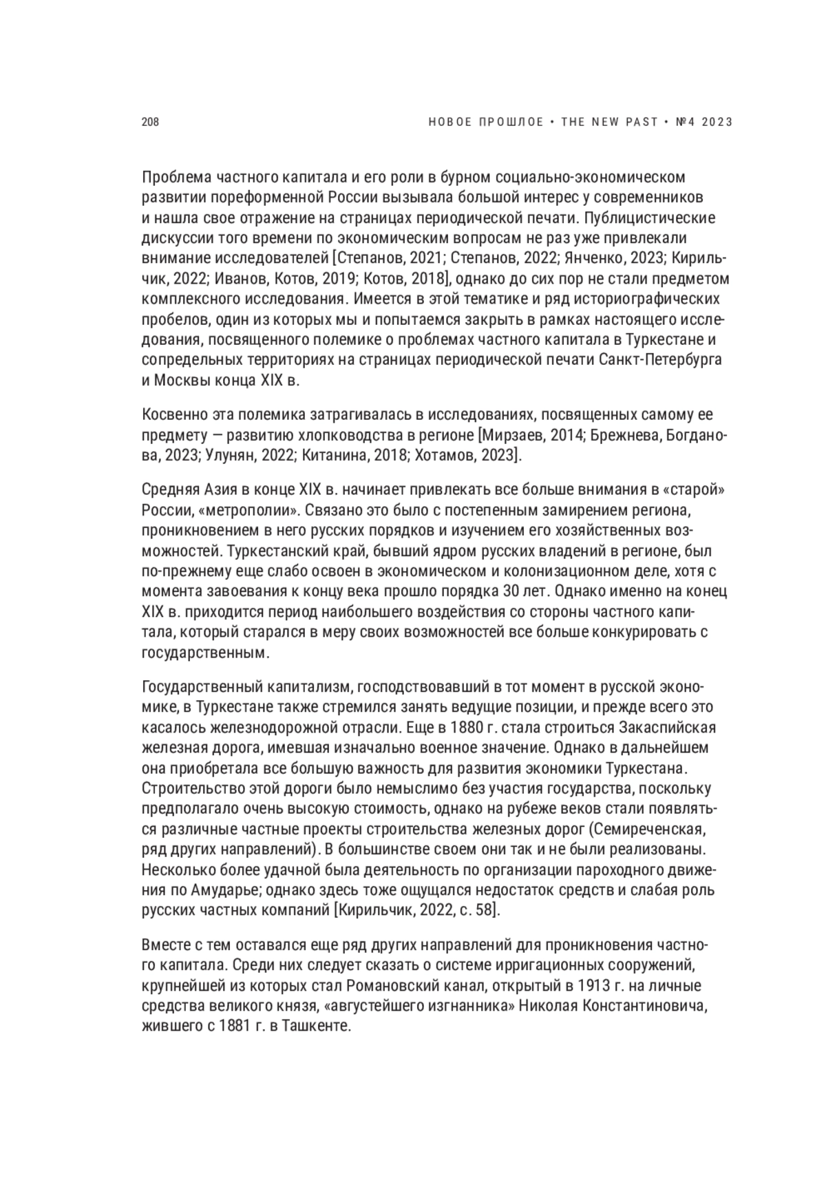 15. Кирильчик Д.В. Частный капитал в Туркестане: дискуссия на страницах периодических изданий в 1880-1910-х гг. // Вестник Московского Университета. Серия 8: История. 2022. № 4. С. 51-64. EDN: VXCSIS