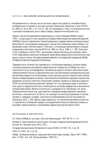 Статья посвящена проекту и реализации европейско-азиатского транзитного сообщения, частью которого в начале ХХ в. стала Китайско-Восточная железная дорога (КВЖД). Акцент сделан на возможностях транзита через Маньчжурию, рассматриваются вопросы организации перевозки пассажиров, установления общих визовых и валютных правил международных участников, деятельности Международного общества спальных вагонов в обеспечении транзитного сообщения. В статье также анализируются туристический потенциал дороги и причины прерывания движения из-за политических событий. Статья основана на неопубликованных источниках из федеральных (РГИА, РГАЭ, РГАСПИ) и регионального (ГАХК) архивов. Используя историко-генетический метод, можно сделать вывод, что дорога сыграла свою роль в укреплении влияния России на Дальнем Востоке, способствовала экономическому развитию Маньчжурии и ее колонизации, стала центром русского присутствия в Китае, но надежды, которые возлагало российское правительство и общество на КВЖД как часть транзитного пути, не оправдались. Международная ситуация, политические осложнения нарушали транзитное движение, так что потенциал КВЖД как части европейско-азиатского сообщения в первой половине ХХ в. не был реализован