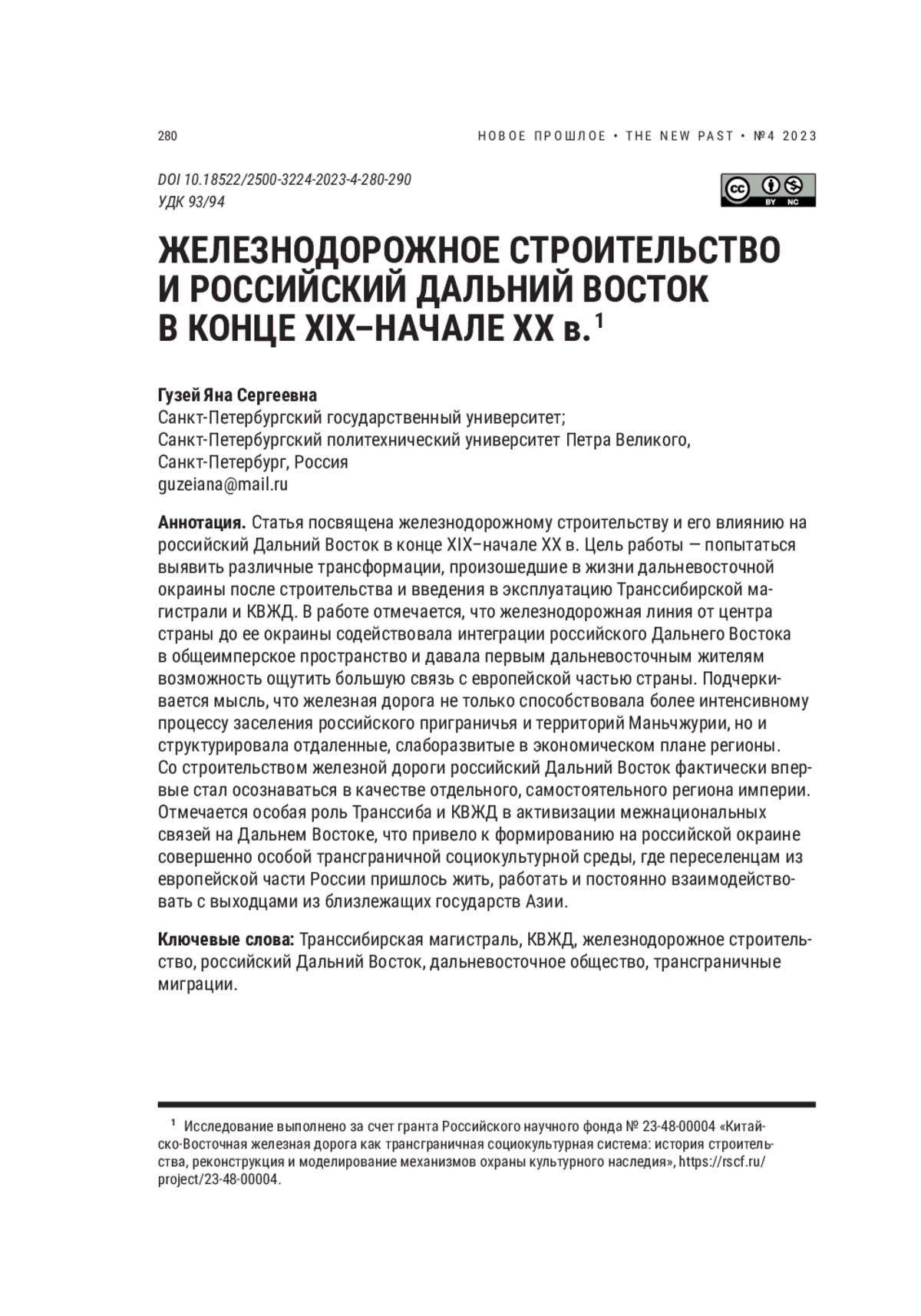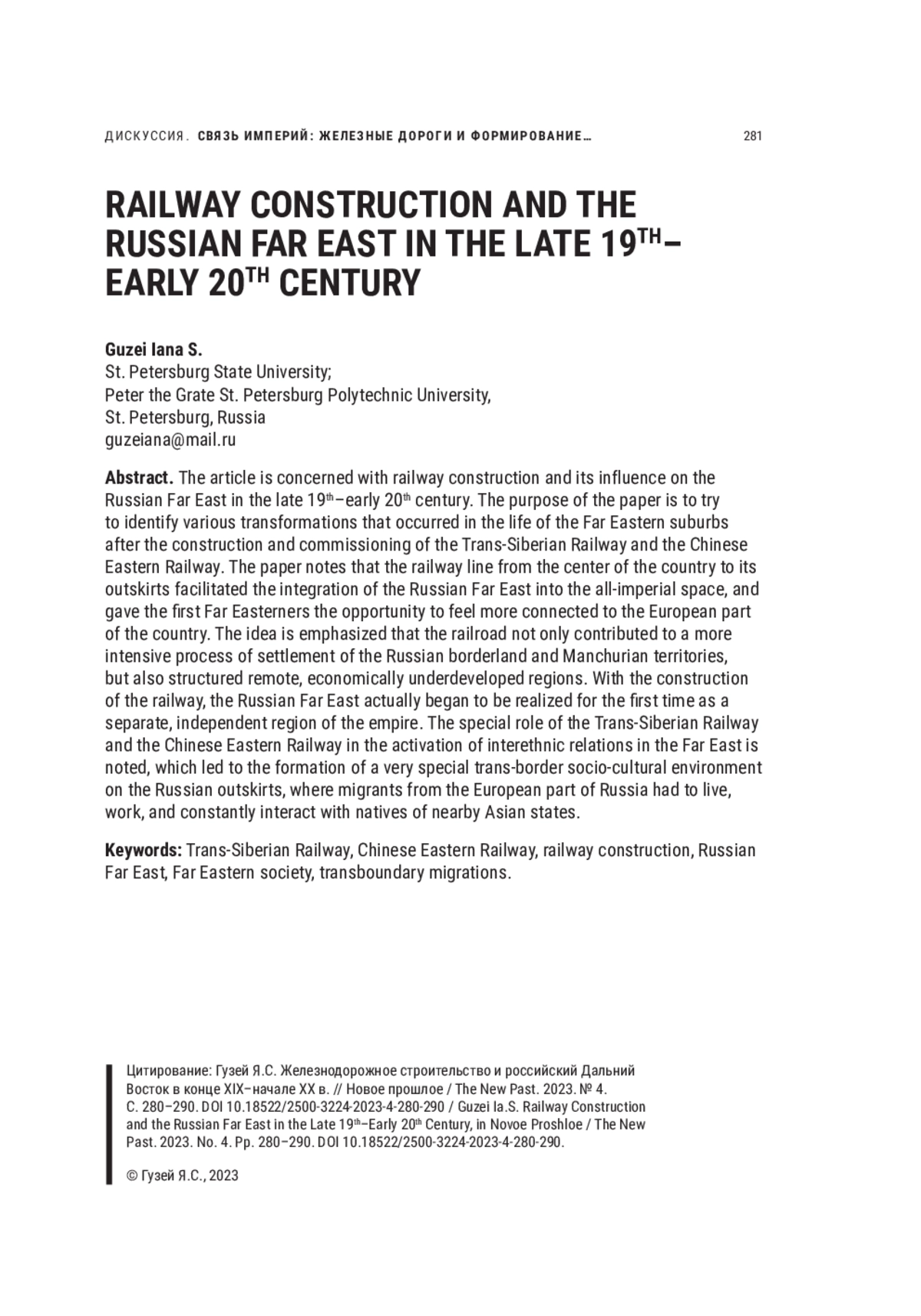 Статья посвящена истории российского железнодорожного строительства на Дальнем Востоке в конце XIX–начале XX в. Сопряжение внешне- и внутриполитических причин стимулировало Российскую империю к беспрецедентному по своим масштабам и интенсивности освоению данного региона. Одной из ключевых проблем, по сравнению с уже имевшимся опытом и апробированными региональными практиками управления, для государства в данном случае стали расстояния. Строительство самой протяженной в мире Транссибирской магистрали и ее ответвления на территории Северной Маньчжурии — Китайско-Восточной железной дороги — привели к более активному социальному, экономическому и культурному освоению примыкающих к ним территорий. Создание новой железнодорожной инфраструктуры, включение в этот процесс разномасштабных и разноуровневых политических, экономических, административных и общественных акторов превратили регион из безлюдного и далекого края в динамично развивающуюся трансграничную зону с новыми для империи системами взаимоотношений. Специфику данному процессу придавал и пограничный характер территорий, через которые прокладывались новые транспортные пути. С одной стороны, происходила фиксация межгосударственных границ, а с другой — их преодоление не только на государственном уровне (постройка Россией на территории Маньчжурии КВЖД), но и локальном, когда вдоль железнодорожных линий формировалась система населенных пунктов со смешанным населением, новыми для империи экономическими и административными практиками