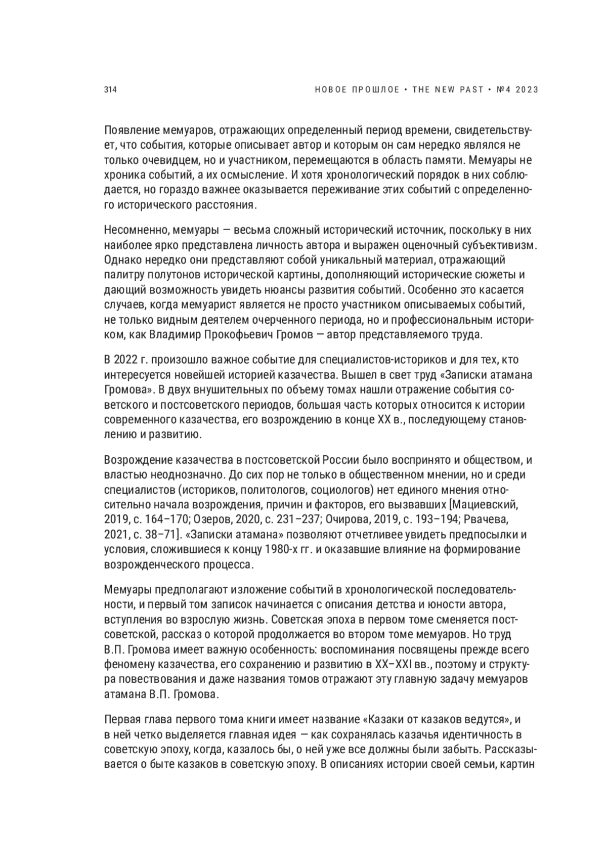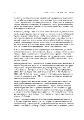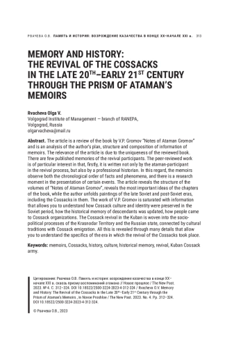 Статья является рецензией на книгу В. П. Громова «Записки атамана Громова» и представляет собой анализ замысла автора, структуры и состава информации «Записок…». Актуальность настоящей статьи обусловлена уникальностью рецензируемой книги: опубликованных воспоминаний участников возрождения немного. Рецензируемый труд представляет особый интерес, поскольку написавший его атаман, участник возрожденческого процесса, является еще и профессиональным историком. В связи с этим в мемуарах не только соблюдается хронологический порядок фактов и явлений, но и присутствует исследовательский момент в представлении тех или иных событий. В статье раскрывается структура томов «Записок атамана Громова», выявляются важнейшие идеи глав книги, показывается, как автор разворачивает картины позднесоветской и постсоветской эпох, включая в них казачество. Работа В. П. Громова насыщена информацией, позволяющей понять, как сохранялась казачья культура и идентичность в советский период, как происходила актуализация исторической памяти у потомков, как люди приходили в казачьи организации. Казачье возрождение на Кубани вплетено в социально-политические процессы Краснодарского края и Российского государства, связано культурными традициями с казачьей эмиграцией. Все это раскрывается через множество деталей, позволяющих понять специфику эпохи, в которой проходило возрождение казачества
