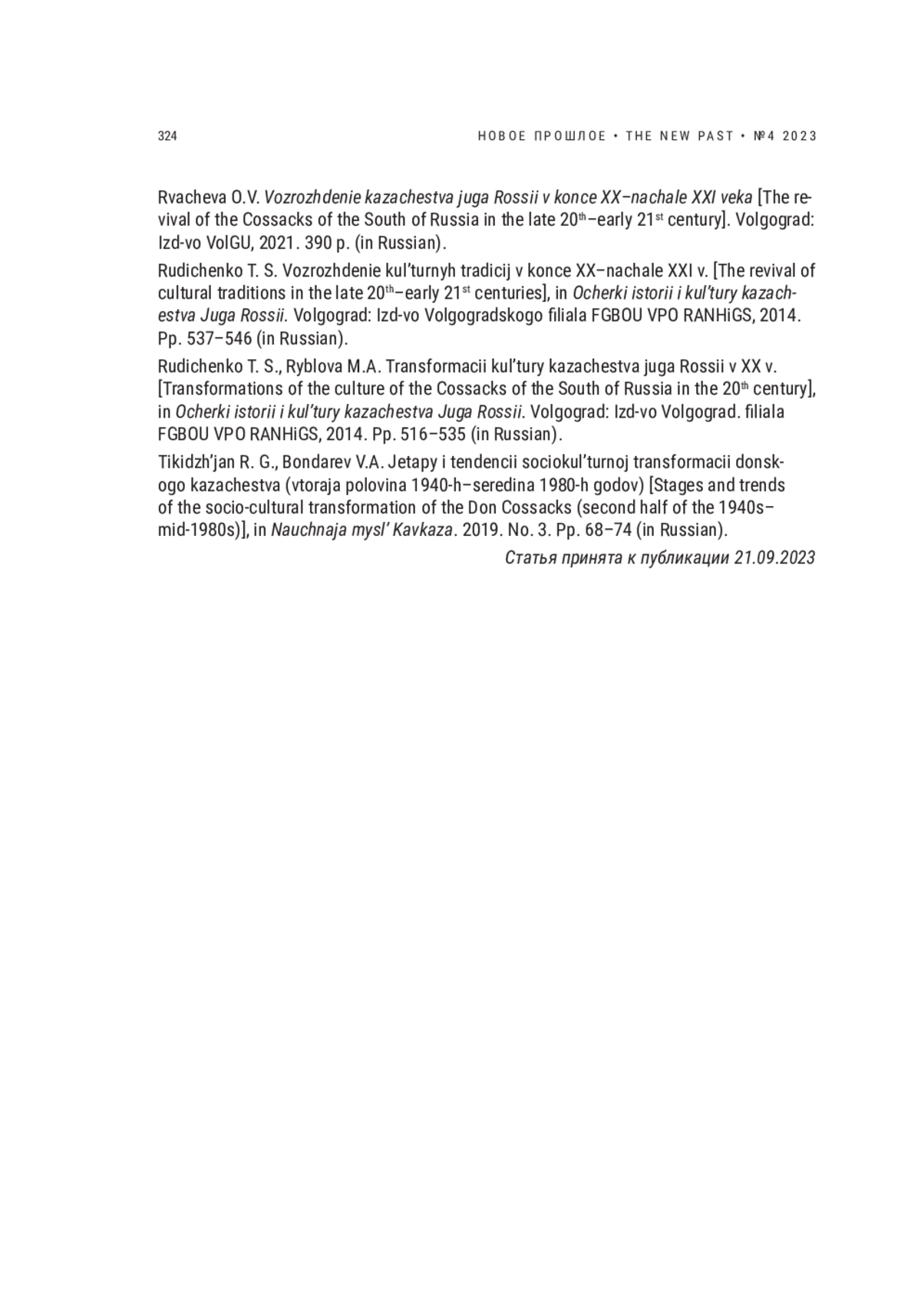 4. Рвачева О.В. Возрождение казачества юга России в конце XX - начале XXI века. Волгоград: Изд-во ВолГУ, 2021. 390 с.
