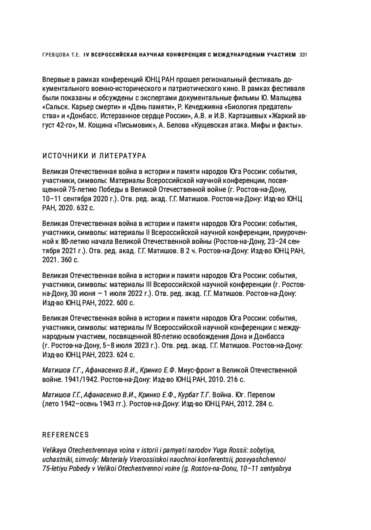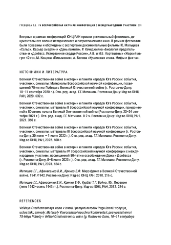 4. Великая Отечественная война в истории и памяти народов Юга России: события, участники, символы: материалы IV Всероссийской научной конференции с международным участием, посвященной 80-летию освобождения Дона и Донбасса (г. Ростов-на-Дону, 5-8 июля 2023 г.). Отв. ред. акад. Г.Г. Матишов. Ростов-на-Дону: Изд-во ЮНЦ РАН, 2023. 624 с.