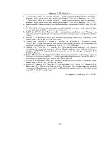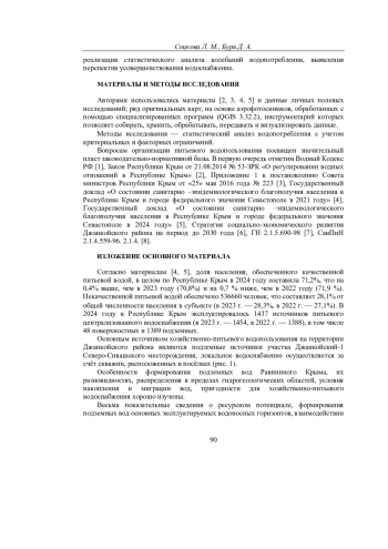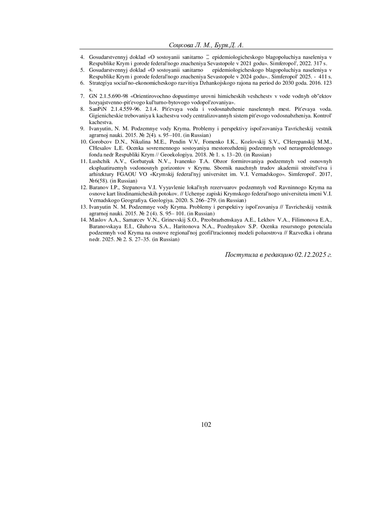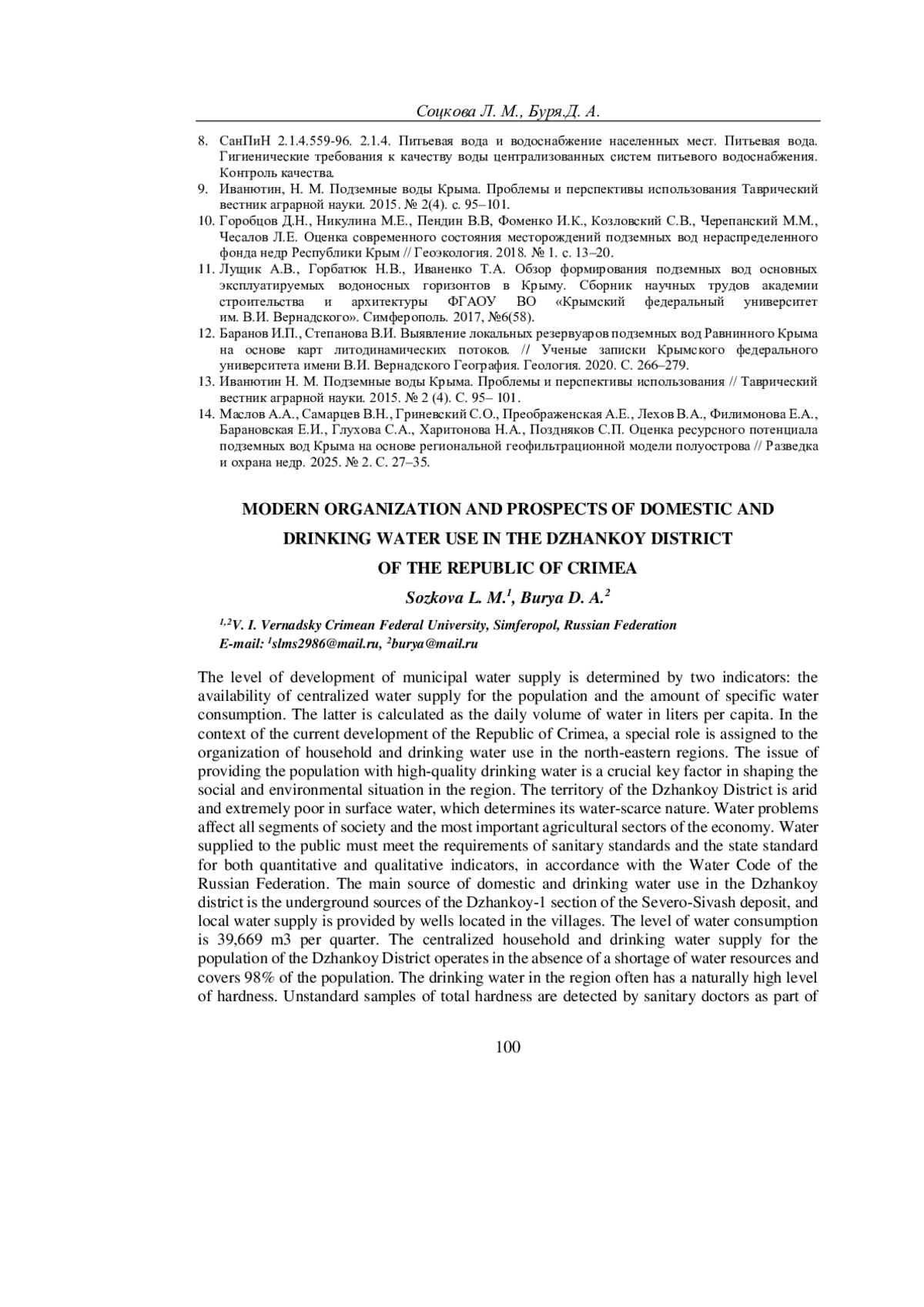 СОЦКОВА Л. М., БУРЯ Д.А. СОВРЕМЕННАЯ ОРГАНИЗАЦИЯ И ПЕРСПЕКТИВЫ ХОЗЯЙСТВЕННО - ПИТЬЕВОГО ВОДОПОЛЬЗОВАНИЯ НА ТЕРРИТОРИИ ДЖАНКОЙСКОГО РАЙОНА РЕСПУБЛИКИ КРЫМ // УЧЕНЫЕ ЗАПИСКИ КРЫМСКОГО ФЕДЕРАЛЬНОГО УНИВЕРСИТЕТА ИМЕНИ В. И. ВЕРНАДСКОГО. ГЕОГРАФИЯ. ГЕОЛОГИЯ. 2025. ТОМ 11 (77). № 4