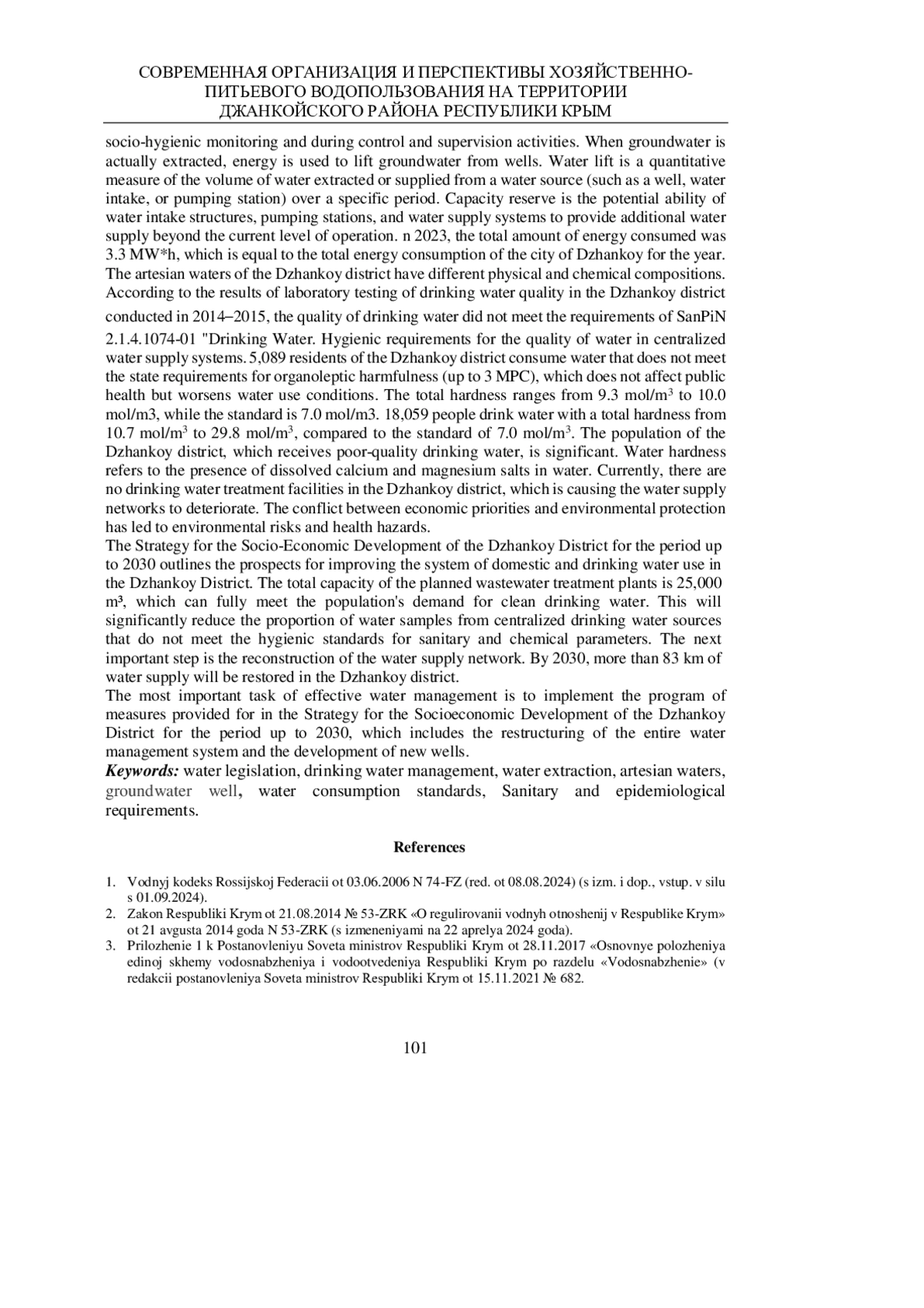Статья: СОВРЕМЕННАЯ ОРГАНИЗАЦИЯ И ПЕРСПЕКТИВЫ ХОЗЯЙСТВЕННО - ПИТЬЕВОГО ВОДОПОЛЬЗОВАНИЯ НА ТЕРРИТОРИИ ДЖАНКОЙСКОГО РАЙОНА РЕСПУБЛИКИ КРЫМ (2025)