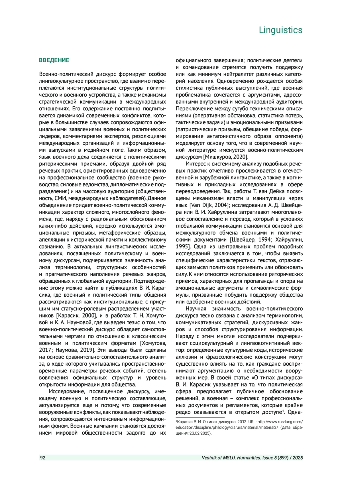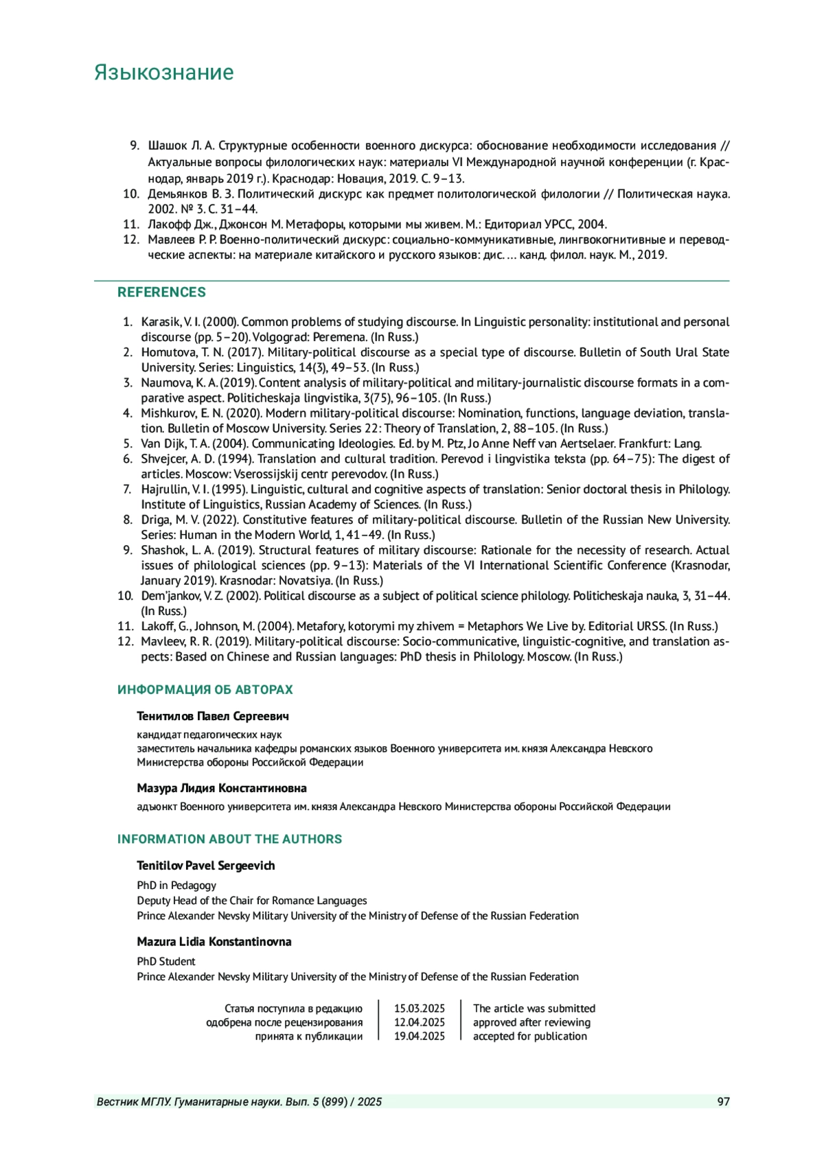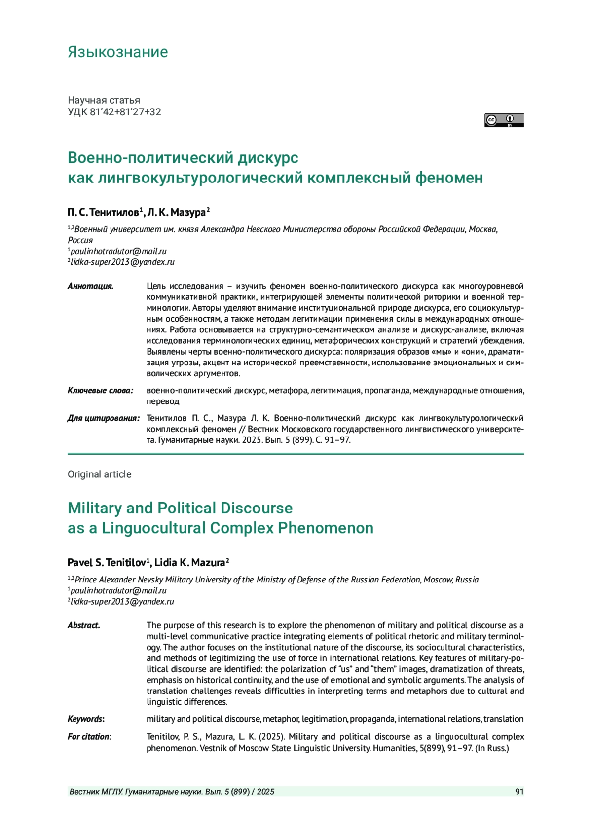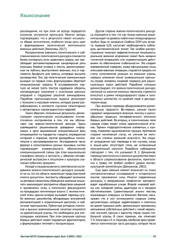 ТЕНИТИЛОВ П. С., МАЗУРА Л. К. ВОЕННО-ПОЛИТИЧЕСКИЙ ДИСКУРС КАК ЛИНГВОКУЛЬТУРОЛОГИЧЕСКИЙ КОМПЛЕКСНЫЙ ФЕНОМЕН // ВЕСТНИК МОСКОВСКОГО ГОСУДАРСТВЕННОГО ЛИНГВИСТИЧЕСКОГО УНИВЕРСИТЕТА. ГУМАНИТАРНЫЕ НАУКИ. 2025. № 5 (899)