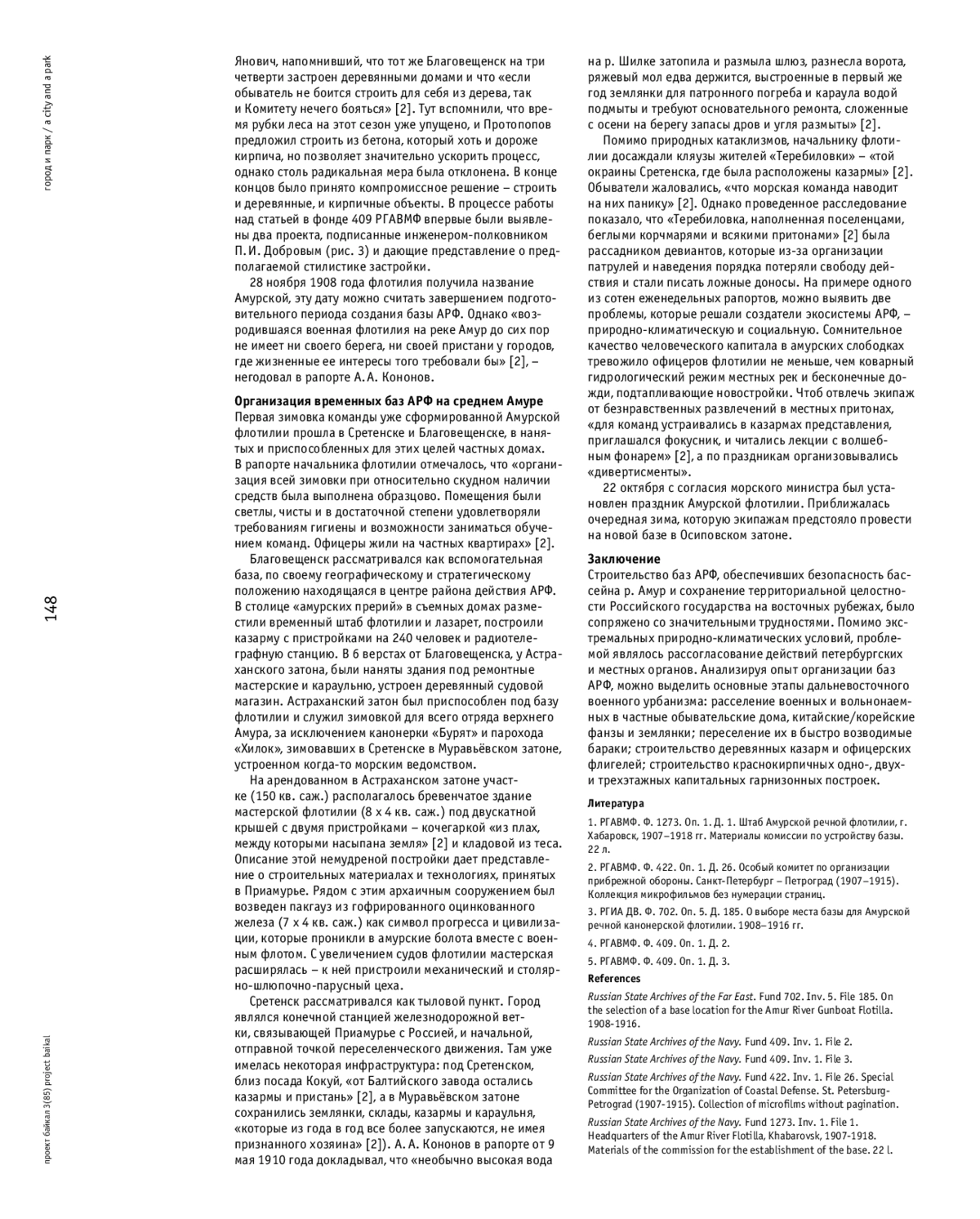 Статья посвящена истории создания оборонительной линейной структуры Амурского бассейна (1906-1914) и основана на новых материалах, выявленных в фондах Российского государственного архива Военно-морского флота, Российского государственного исторического архива Дальнего Востока (РГИА ДВ) и Российского государственного военно-исторического архива (РГВИА). Работа выполнена при поддержке Российского научного фонда в рамках исследования «Военная тема в архитектурно-пространственном освоении Дальнего Востока». Рассматриваются предпосылки создания Амурской речной флотилии, руководящая роль Комитета по организации береговой обороны (Санкт-Петербург), выбор места для базы флотилии под Хабаровском и проблемы с землеотводом, а также строительство временных баз под Сретенском и Благовещенском.