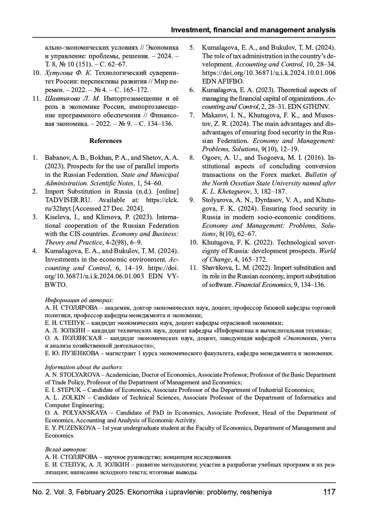 9. Столярова А. Н., Дырдасов В. А., Хутугова Ф. К. Обеспечение продовольственной безопасности в России в современных социально-экономических условиях // Экономика и управление: проблемы, решения. - 2024. - Т. 8, № 10 (151). - С. 62-67. EDN: TIJDSX