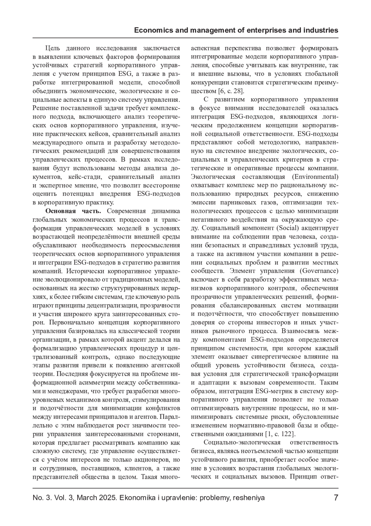Статья посвящена исследованию формирования устойчивых стратегий корпоративного управления в контексте интеграции ESG-подходов (экологические, социальные и управленческие факторы) и социально-экологической ответственности бизнеса. Рассмотрены основные теоретические основы корпоративного управления и роль ESG в современных стратегиях организаций. Описаны механизмы внедрения ESG-стандартов, включая внутренние и внешние факторы, а также предложены подходы к оценке эффективности таких стратегий через использование специализированных метрик и индикаторов. В статье анализируются лучшие мировые практики и кейс-стади, что позволяет сформировать рекомендации для российских компаний по адаптации и внедрению ESG-подходов в рамках устойчивого корпоративного управления. Особое внимание уделяется важности учета социально-экологических факторов для повышения прозрачности, улучшения имиджа и привлечения инвестиций.