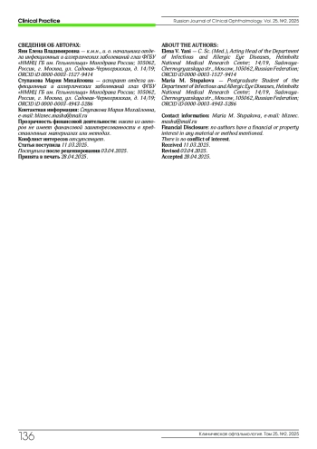 Результаты исследования: язва роговицы стала показанием к проведению СКП в 18 случаях, второй по частоте причиной послужила болезнь роговичного трансплантата (БТ) — 10 случаев, в 4 случаях СКП проводили по причине формирования бельма роговицы. СКП с одномоментной факоэмульсификацией и имплантацией интраокулярной линзы была выполнена в 4 случаях при язве роговицы и в 1 случае при БТ, в 3 случаях при язве роговицы гонококковой этиологии проводили СКП с одномоментной экстракапсулярной экстракцией катаракты, еще в 1 случае аналогичное вмешательство было выполнено при рекератопластике по причине БТ. В 18 случаях офтальмохирургические вмешательства и ношение контактных линз плановой замены явились пусковыми факторами воспалительных заболеваний роговицы. Согласно результатам лучевых исследований доминировали билатеральное поражение ОНП (15 случаев) и ипсилатеральное поражение (9 случаев). Во всех случаях в результате проведенных вмешательств удалось достигнуть анатомической целостности глаза, в 26 случаях достигнут зрительный результат с максимально корригированной остротой зрения до 0,1 и выше.