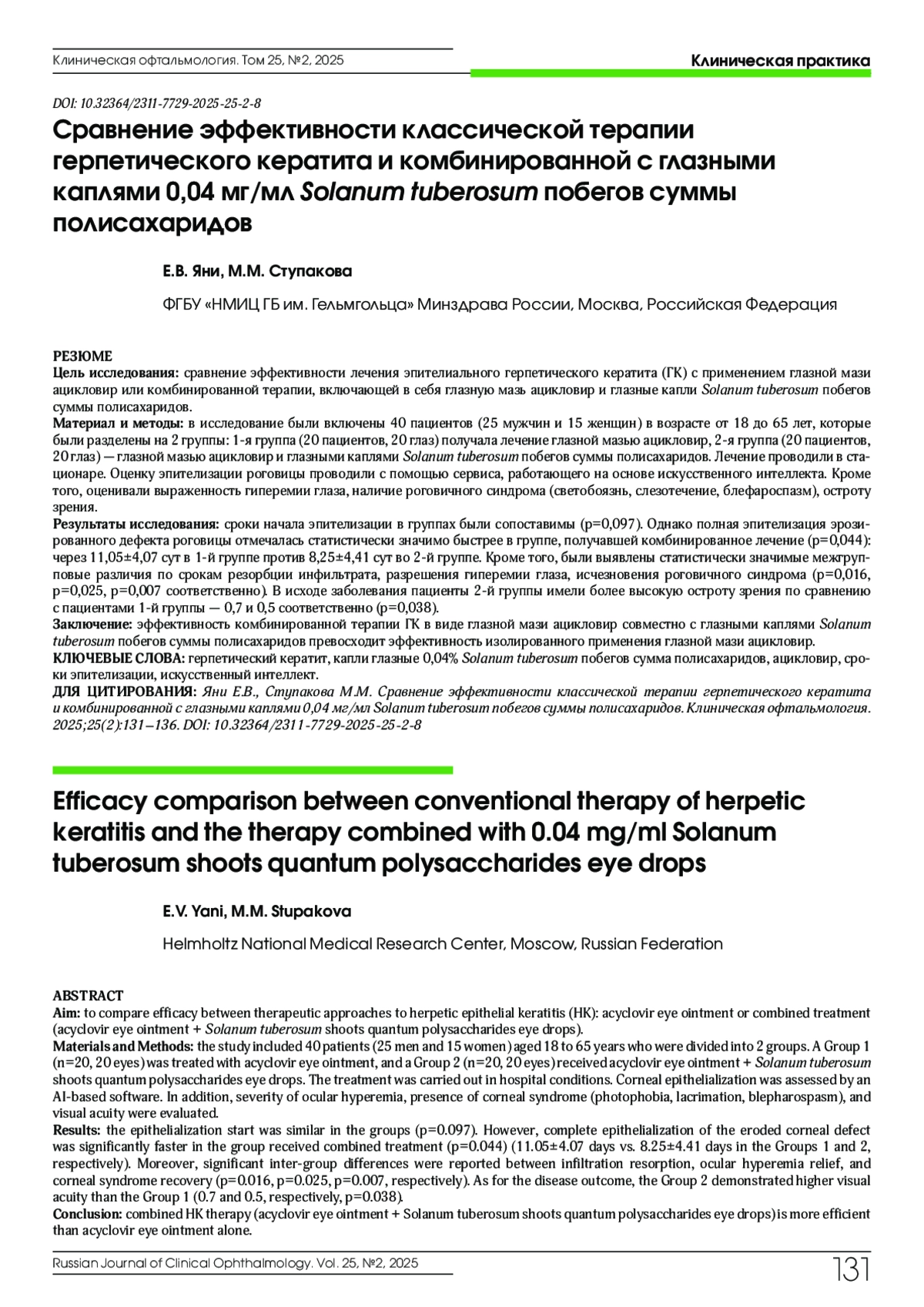 Цель исследования: сравнение эффективности лечения эпителиального герпетического кератита (ГК) с применением глазной мази ацикловир или комбинированной терапии, включающей в себя глазную мазь ацикловир и глазные капли Solanum tuberosum побегов суммы полисахаридов.