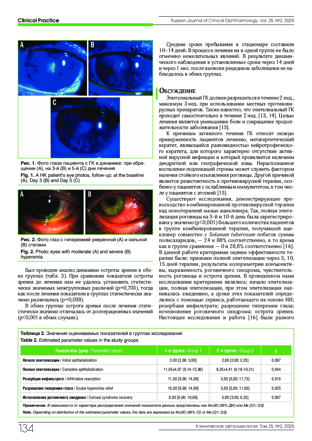 Материал и методы: в исследование были включены 40 пациентов (25 мужчин и 15 женщин) в возрасте от 18 до 65 лет, которые были разделены на 2 группы: 1-я группа (20 пациентов, 20 глаз) получала лечение глазной мазью ацикловир, 2-я группа (20 пациентов, 20 глаз) — глазной мазью ацикловир и глазными каплями Solanum tuberosum побегов суммы полисахаридов. Лечение проводили в стационаре. Оценку эпителизации роговицы проводили с помощью сервиса, работающего на основе искусственного интеллекта. Кроме того, оценивали выраженность гиперемии глаза, наличие роговичного синдрома (светобоязнь, слезотечение, блефароспазм), остроту зрения.