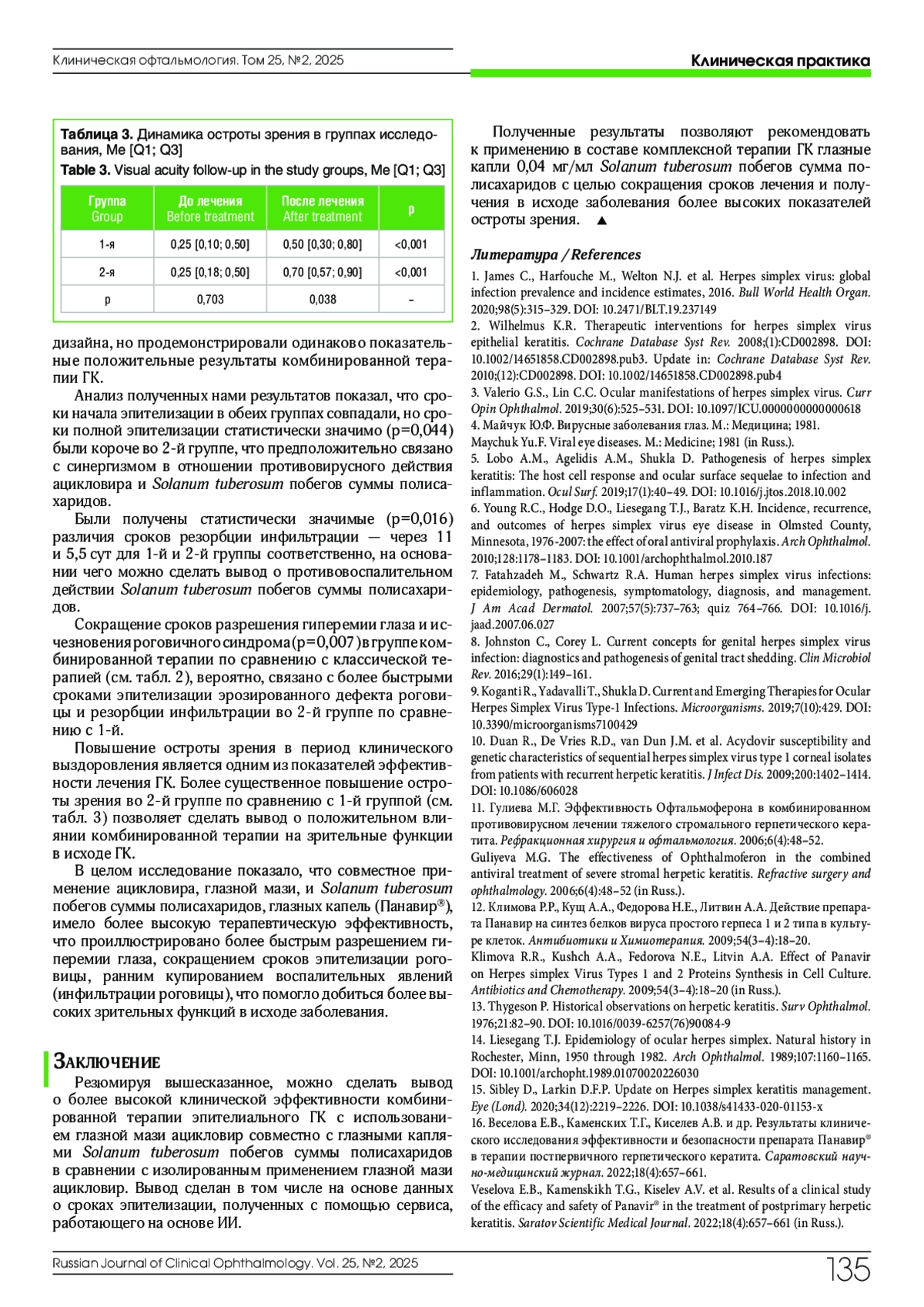 Заключение: эффективность комбинированной терапии ГК в виде глазной мази ацикловир совместно с глазными каплями Solanum tuberosum побегов суммы полисахаридов превосходит эффективность изолированного применения глазной мази ацикловир.