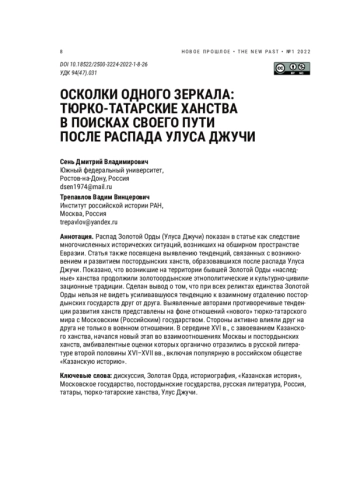 Распад Золотой Орды (Улуса Джучи) показан в статье как следствие многочисленных исторических ситуаций, возникших на обширном пространстве Евразии. Статья также посвящена выявлению тенденций, связанных с возникновением и развитием постордынских ханств, образовавшихся после распада Улуса Джучи. Показано, что возникшие на территории бывшей Золотой Орды «наследные» ханства продолжили золотоордынские этнополитические и культурно-цивилизационные традиции. Сделан вывод о том, что при всех реликтах единства Золотой Орды нельзя не видеть усиливавшуюся тенденцию к взаимному отдалению постордынских государств друг от друга. Выявленные авторами противоречивые тенденции развития ханств представлены на фоне отношений «нового» тюрко-татарского мира с Московским (Российским) государством. Стороны активно влияли друг на друга не только в военном отношении. В середине XVI в., с завоеванием Казанского ханства, начался новый этап во взаимоотношениях Москвы и постордынских ханств, амбивалентные оценки которых органично отразились в русской литературе второй половины XVI–XVII вв., включая популярную в российском обществе «Казанскую историю»