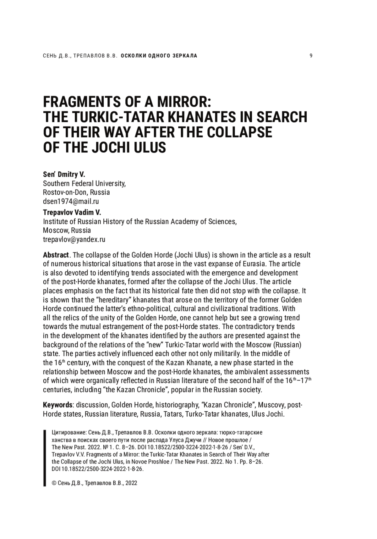 33. Трепавлов В.В. Золотая Орда после распада: воспоминания о единстве // Тюркологический сборник. 2009-2010. Тюркские народы Евразии в древности и средневековье. М.: Восточная литература, 2011. С. 360-383. EDN: OPHRDX