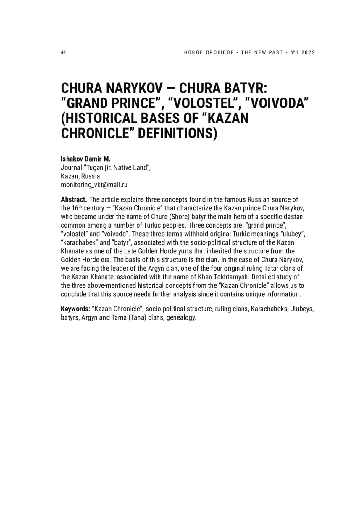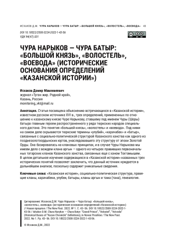 Статья посвящена объяснению встречающихся в «Казанской истории», известном русском источнике XVI в., трех определений, примененных по отношению к казанскому князю Чуре Нарыкову, ставшему под именем Чуры (Шоры) батыра главным героем распространенного у ряда тюркских народов специального дастана. Это понятия «большой князь», «волостель» и «воевода». Под ними на самом деле скрываются тюркские термины «улубий», «карачабек» и «батыр», связанные с социально-политической структурой Казанского ханства как одного из позднезолотоордынских юртов, унаследовавшего эту структуру от эпохи Золотой Орды. Она базировалась на клановых принципах, и в случае Чуры Нарыкова мы имеем дело с вождем клана аргын — одного из четырех правивших первоначальных татарских кланов Казанского ханства, связанных еще с ханом Тохтамышем. В целом детальное изучение содержащихся в «Казанской истории» названных трех исторических понятий позволяет заключить, что данный источник нуждается в дальнейшем анализе, поскольку содержит уникальные сведения