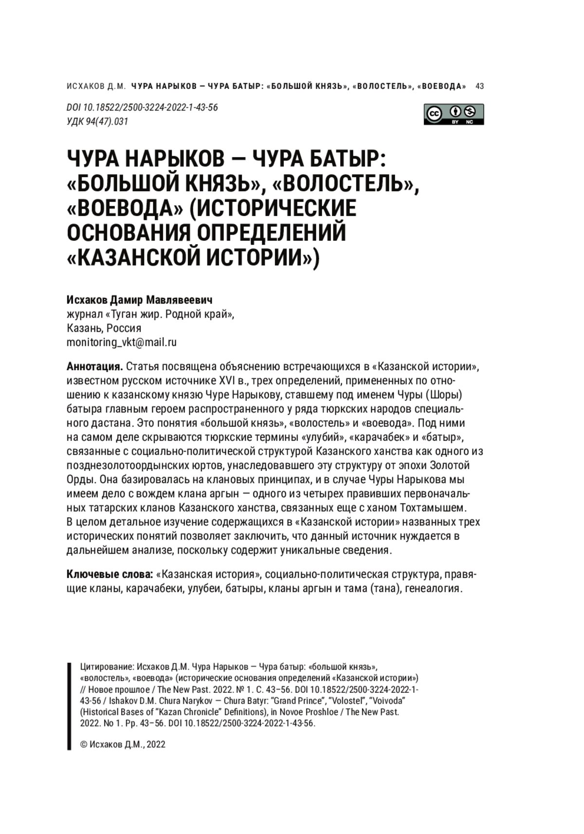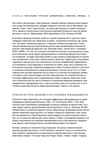 Как сейчас уже доказано, Чура Нарыков, ставший главным героем распространенного у ряда кыпчакоязычных народов отдельного дастана, где он фигурирует под именем «Чура / Чора / Шора батыр», на самом деле являлся в первой половине XVI в. одним из значительных политических деятелей Казанского ханства (более детально о нем см.: [Ибрагимова, 2002; Қорғанбеков, 2014; Исхаков, 2019b]).