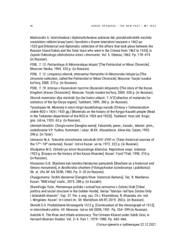 20. Усманов М.А. Татарские исторические источники XVII-XVIII вв. Казань: Изд-во Казан. ун-та, 1972. 222 с.