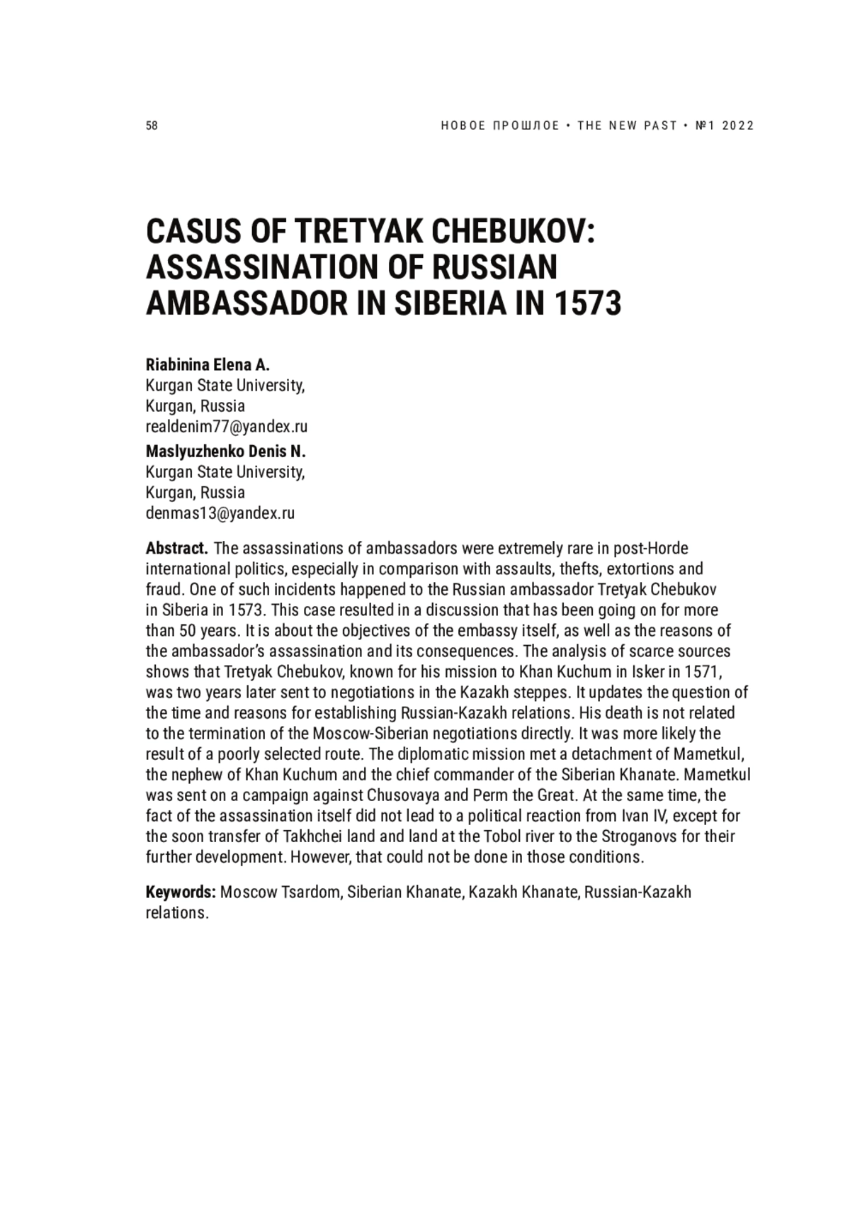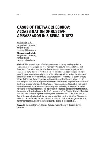 Убийства послов в постордынской международной политике были чрезвычайно редким случаем, особенно в сравнении с нападениями, кражами, вымогательствами и мошенничествами. Один из таких казусов произошел с русским послом Третьяком Чебуковым в Сибири в 1573 г. В результате он вызвал идущую уже более 50 лет дискуссию о причинах и целях самого посольства, а также собственно убийства посла и его последствиях. Анализ немногочисленных источников показывает, что Третьяк Чебуков, хотя и известен по своей миссии в Искер к хану Кучуму в 1571 г., спустя два года был отправлен на переговоры в казахские степи, что актуализирует вопрос о времени и причинах установления русско-казахских отношений. Его смерть при этом не связана напрямую с прекращением московскосибирских переговоров, а скорее была следствием неудачно выбранного маршрута, в результате чего дипломатическая миссия встретила на пути отряд Маметкула, племянника хана Кучума и главного полководца Сибирского ханства, отправленного в поход на Чусовую и Пермь Великую. При этом сам факт убийства не повлек за собой политической реакции со стороны Ивана IV, если не считать таковой вскоре последовавшую передачу земель на Тахчее и Тоболе Строгановым для их дальнейшего освоения, что, однако, в тех условиях выполнить не удалось
