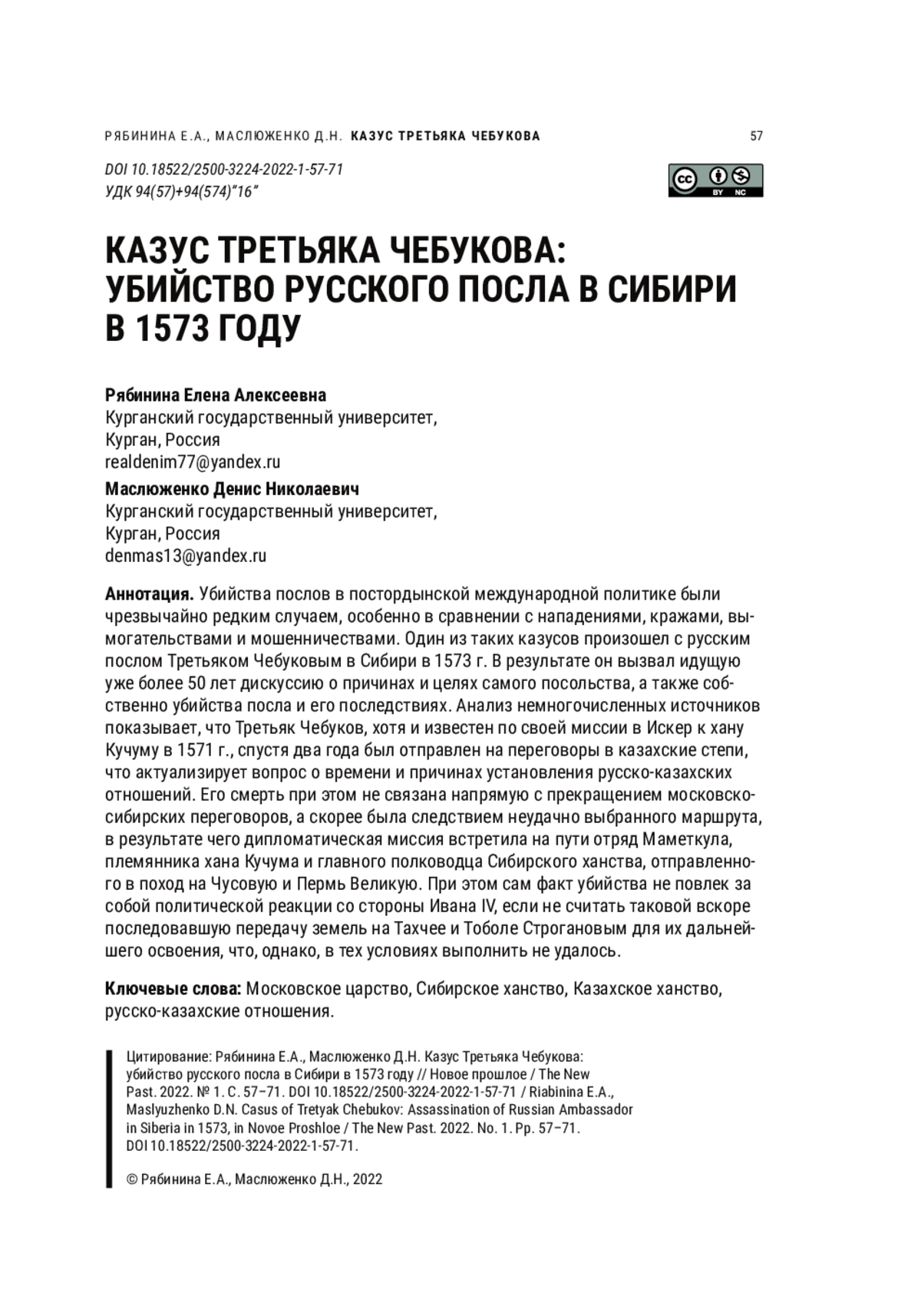 10. Беляков А.В. Русско-сибирские дипломатические контакты по сведениям Титулярника 1577 г.: новое прочтение старых документов // Древняя Русь. Вопросы медиевистики. 2021. № 1(83). С. 56-65. EDN: XIPOKW