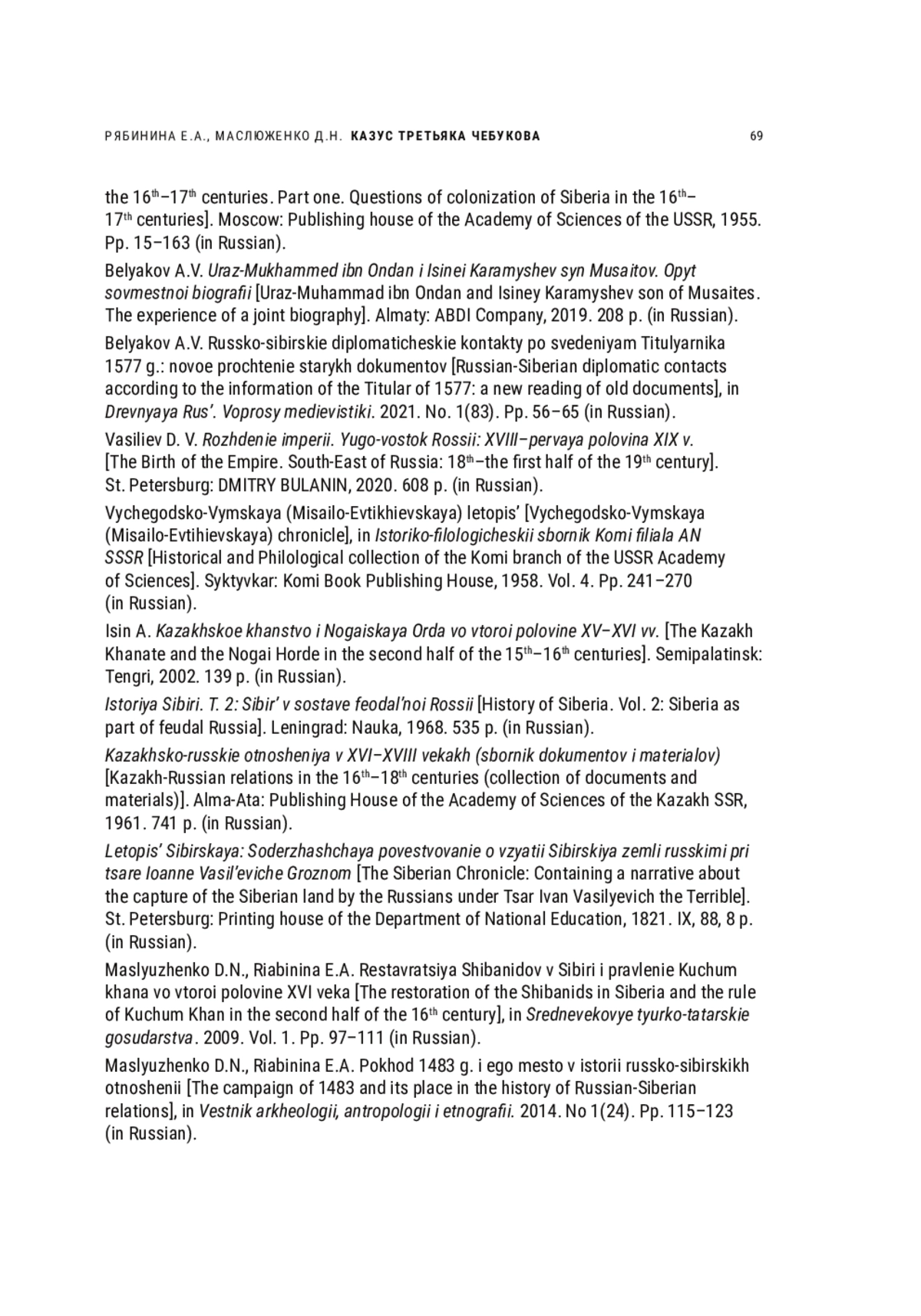 17. Маслюженко Д.Н., Рябинина Е.А. Реставрация Шибанидов в Сибири и правление Кучум хана во второй половине XVI века // Средневековые тюрко-татарские государства. Вып. 1. 2009. С. 97-111. EDN: TEDXAZ