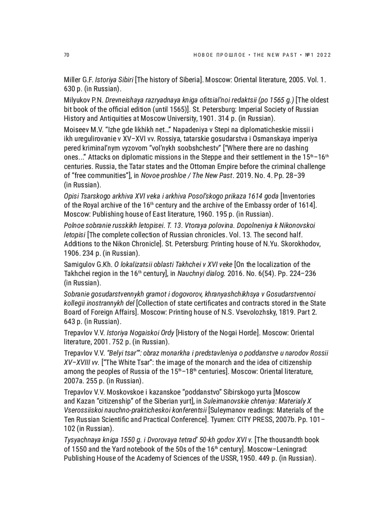 21. Моисеев М.В. “Иже где лихих нет…” Нападения в Степи на дипломатические миссии и их урегулирование в XV-XVI вв. Россия, татарские государства и Османская империя перед криминальным вызовом “вольных сообществ” // Новое прошлое / The New Past. 2019. № 4. С. 28-39. EDN: IKEGZC