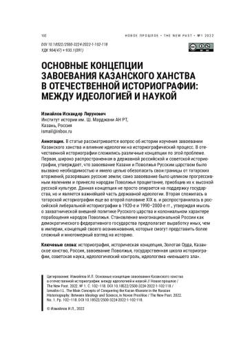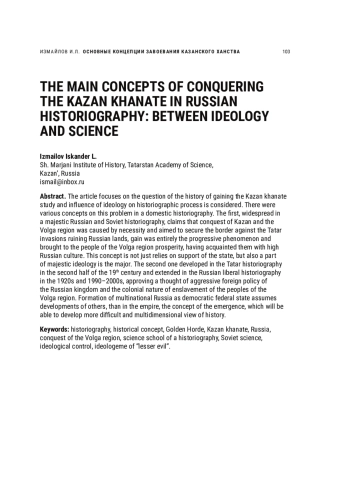 В статье рассматривается вопрос об истории изучения завоевании Казанского ханства и влияние идеологии на историографический процесс. В отечественной историографии сложились различные концепции по этой проблеме. Первая, широко распространенная в державной российской и советской историографии, утверждает, что завоевание Казани и Поволжья Русским царством было вызвано необходимостью и имело целью обезопасить свои границы от татарских вторжений, разорявших русские земли; само завоевание было целиком прогрессивным явлением и принесло народам Поволжья процветание, приобщив их к высокой русской культуре. Данная концепция не просто опирается на поддержку государства, но и является важнейшей часть державной идеологии. Вторая сложилась в татарской историографии еще во второй половине XIX в. и распространилась в российской либеральной историографии в 1920-е и 1990–2000-е гг., утверждая мысль о захватнической внешней политике Русского царства и колониальном характере порабощения народов Поволжья. Становление многонациональной России как демократического федеративного государства предполагает выработку иных, чем в империи, концепций своего возникновения, которые смогут представить более сложный и многомерный взгляд на историю