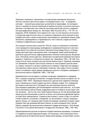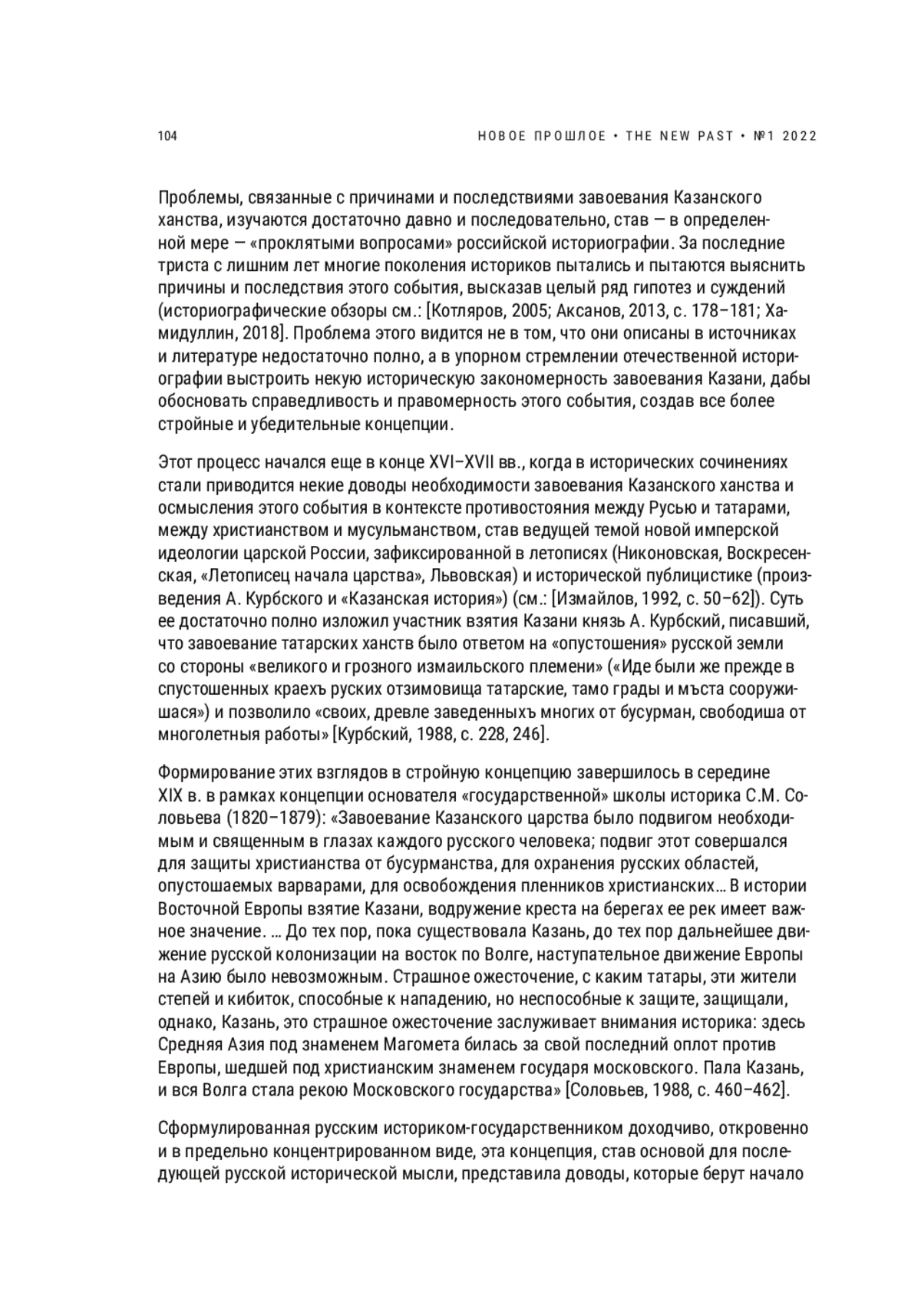 Проблемы, связанные с причинами и последствиями завоевания Казанского ханства, изучаются достаточно давно и последовательно, став — в определенной мере — «проклятыми вопросами» российской историографии. За последние триста с лишним лет многие поколения историков пытались и пытаются выяснить причины и последствия этого события, высказав целый ряд гипотез и суждений (историографические обзоры см.: [Котляров, 2005; Аксанов, 2013, с. 178–181; Хамидуллин, 2018]. Проблема этого видится не в том, что они описаны в источниках и литературе недостаточно полно, а в упорном стремлении отечественной историографии выстроить некую историческую закономерность завоевания Казани, дабы обосновать справедливость и правомерность этого события, создав все более стройные и убедительные концепции
