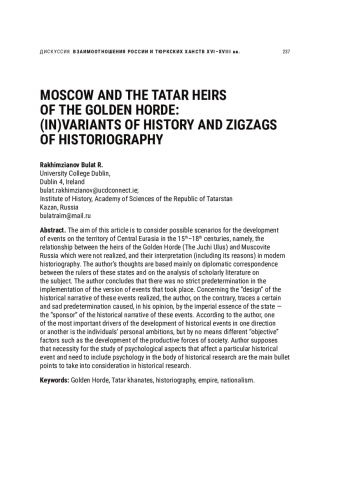 Цель статьи — рассмотреть возможные варианты развития событий на территории Центральной Евразии в XV–XVIII вв., касающиеся взаимоотношений наследников Золотой Орды (Улуса Джучи) и Московской Руси, которые не были реализованы, и их интерпретацию (включая ее причины) в современной историографии. Рассуждения автора базируются преимущественно на материалах дипломатической переписки между правителями указанных государств и анализе исследовательской литературы по проблематике. Автор приходит к выводу, что строгой предопределенности в реализации той версии событий, которая имела место, не было. В отношении же оформления исторического нарратива этих реализованных событий автор, напротив, прослеживает некую печальную предопределенность, вызванную, по его мнению, имперской сутью государства — «спонсора» историописания данных событий. По мнению автора, одним из важнейших двигателей развития исторических событий в том или ином направлении являются личные амбиции отдельных людей, но отнюдь не разноплановые «объективные» факторы — вроде развития производительных сил общества. Акцентируется внимание на необходимости изучения психологических моментов, влияющих на то или иное историческое событие, на включении психологии в пространство исторических исследований