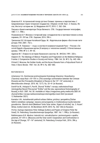 1. Артамонов В.А. Державное противостояние Крымского ханства и Княжества (Царства) всея Руси в XV-XVI вв. // Меншиковские чтения. 2016. № 7 (17). С. 33-41. EDN: XBOPDX