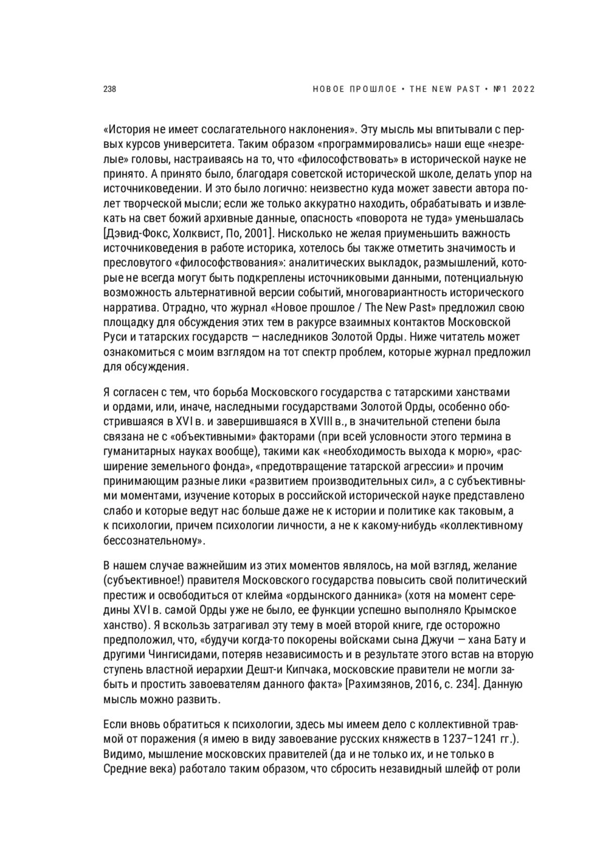 В статье на основе предложенных редакцией журнала «Новое прошлое /The New Past» вопросов для дискуссии рассматриваются основные тенденции изучения взаимоотношений Московской Руси и пост-ордынских государств в раннее Новое время. Отталкиваясь от достижений современной отечественной историографии (работ А. Л. Хорошкевич, В. В. Трепавлова, И. В. Зайцева, А. В. Белякова и других), автор рассматривает проблему т. н. политического наследия Золотой Орды, предлагая отделять реальное политическое наследство, выразившееся в подчинении бывших ордынских улусов, от наследия идеологического, которое никогда не существовало в виде оформленной внешнеполитической концепции. Отмечая актуализацию золотоордынского нарратива в общественном сознании после 1991 г. и появление новых, позитивных по сравнению с прошлым, коннотаций в его оценке, автор подчеркивает, что в то же время этот нарратив не особенно сочетается с политикой исторической памяти современного российского государства, которая концентрируется на военных победах и триумфах прошлого.