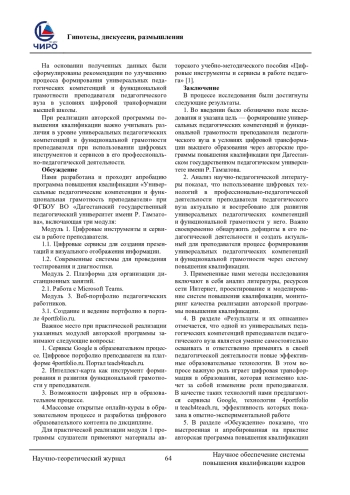В данной площадке преподаватель может ознакомиться с цифровыми учебно-методическими материалами коллег из других вузов и продвигать инновационные авторские учебно-методические материалы. Здесь есть возможность оценить свои разработки и получать дополнительные заработки. Проведен анализ практического опыта по реализации программы авторского курса повышения квалификации преподавателей на базе Института физико-математического и информационно-технологического образования при Дагестанском государственном педагогическом университете имени Р. Гамзатова.