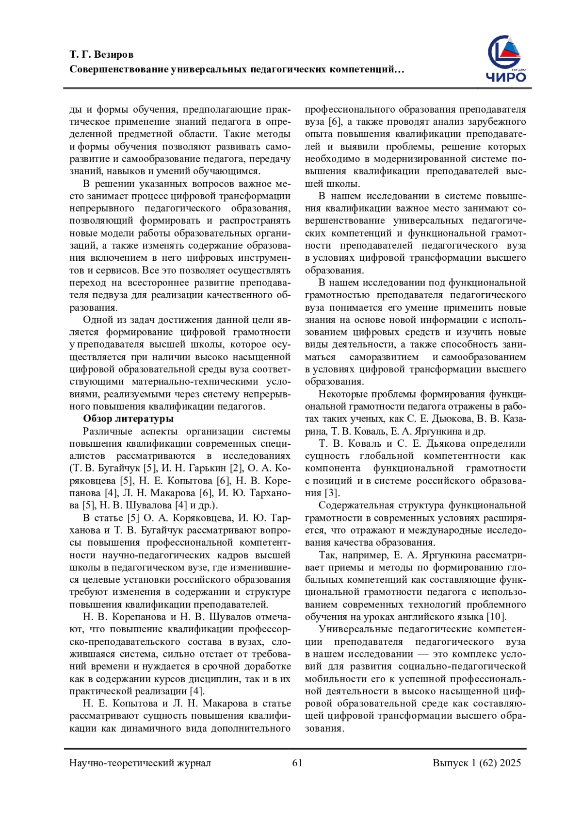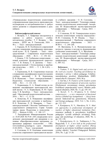 5. Коряковцева, О. А. Новый взгляд на повышение квалификации преподавателей высшей школы / О. А. Коряковцева, И. Ю. Тарханова, Т. В. Бугайчук. - Текст: непосредственный // Ярославский педагогический вестник. - 2016. - № 3. - С. 13-20. EDN: WRQEAZ