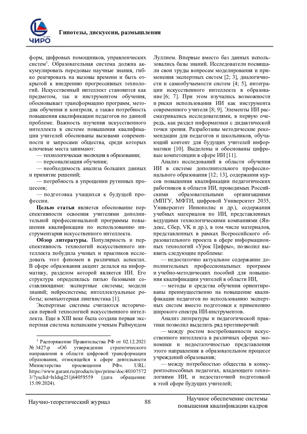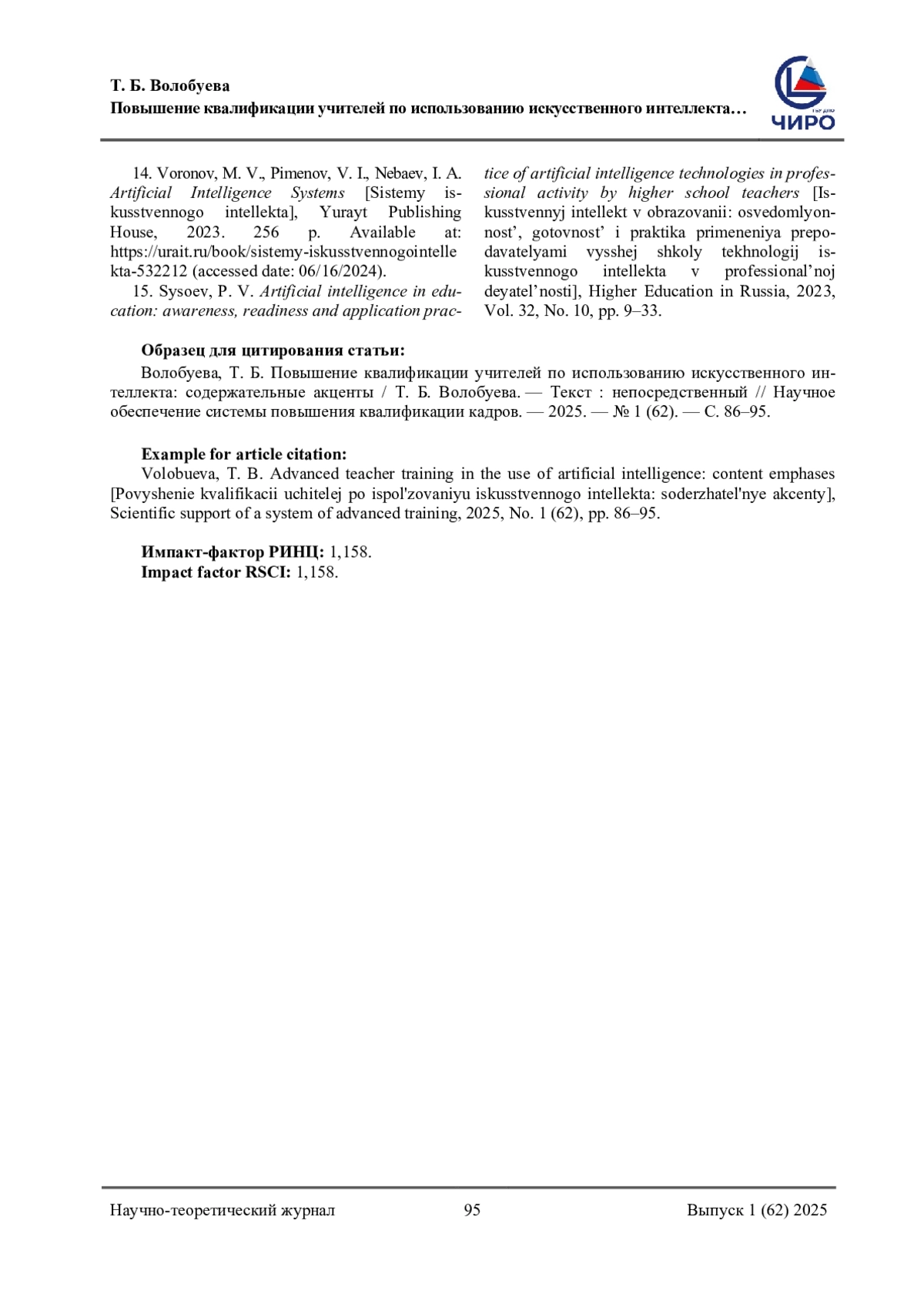 Проблема исследования и обоснование ее актуальности. В статье рассматривается повышение квалификации педагогов по проблеме искусственного интеллекта. Искусственный интеллект предоставляет учителям широкий спектр инструментов для улучшения учебного процесса, от адаптивного обучения до автоматизированных систем оценки. Однако, несмотря на очевидные преимущества, его использование в образовании требуют специального обучения педагогических работников для успешного интегрирования искусственного интеллекта в педагогическую практику. Цель данного исследования состоит в обосновании перспективности для педагогов повышения квалификации по использованию искусственного интеллекта в педагогической практике. Методология (материалы и методы). Методологической основой исследования послужили научные взгляды, концепции, системные построения по проблемам образования, новые информационные технологии, инструменты искусственного интеллекта, используемые в образовательном процессе с целью повышения его эффективности и качества, положения современной дидактики. Результаты. В статье анализируются труды современных ученых и практиков по проблеме применения искусственного интеллекта в образовательном процессе, формулируются противоречие и обосновывается актуальность исследования. На основе анализа практического применения искусственного интеллекта педагогами в обучении выделяются перспективные в методическом плане технологии искусственного интеллекта. Аргументируются учебные модули дополнительной профессиональной программы повышения квалификации по освоению педагогическими работниками цифровых интеллектуальных сервисов и технологий. Обосновываются результаты пилотной реализации программы. Ранжируется профессиональное оценивание слушателями сильных и слабых сторон применения искусственного интеллекта в образовательном процессе. Теоретическая значимость исследования состоит в систематизации литературы по проблеме исследования, в обосновании потенциала повышения квалификации учителей по освоению технологий искусственного интеллекта. Научная новизна отражается в постановке проблемы и научно-методическом обосновании целевой дополнительной профессиональной программы, в отборе и описании перспективных для внедрения в образовательный процесс технологий искусственного интеллекта. Практическая значимость публикации состоит в том, что описанные учебные модули могут применяться в дополнительном профессиональном обучении педагогов. Заключение. Установлена целесообразность повышения квалификации учителей по освоению современных инструментов искусственного интеллекта, методический потенциал которых открывает большое количество возможностей для формирования уникальной передовой образовательной практики, позволяющей обогатить традиционный учебный процесс и в полном масштабе реализовать концепцию персонализированного и адаптивного обучения в условиях цифровизации.
