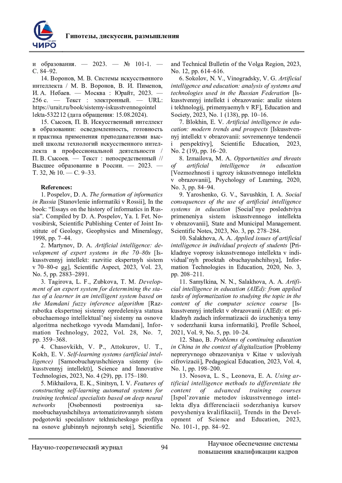11. Самылкина, Н.Н. Искусственный интеллект в образовании (AIEd): от прикладных задач информатизации до изучения темы в содержании курса информатики/ Н. Н. Самылкина, А. А. Салахова. - Текст: непосредственный // Профильная школа. - 2021. - Том 9, № 5. - С. 10-24. EDN: XGYXSG