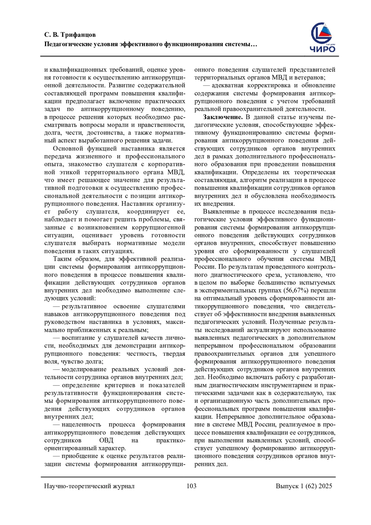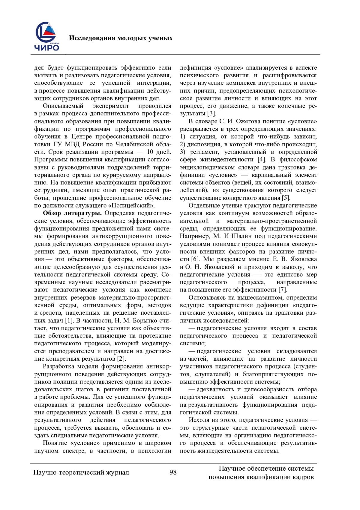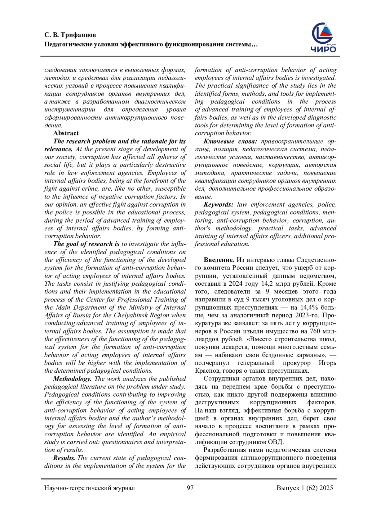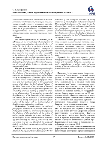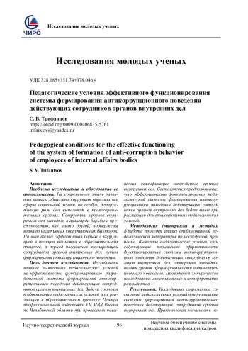Проблема исследования и обоснование ее актуальности. На современном этапе развития нашего общества коррупция поразила все сферы социальной жизни, но особую деструктивную роль она выполняет в правоохранительных органах. Сотрудники органов внутренних дел, находясь в авангарде борьбы с преступностью, как никто другой, подвержены влиянию негативных коррупционных факторов. На наш взгляд, эффективная борьба с коррупцией в полиции возможна в образовательном процессе, в период повышения квалификации сотрудников органов внутренних дел, путем формирования антикоррупционного поведения. Цель данного исследования. Исследовать влияние выявленных педагогических условий на эффективность функционирования разработанной системы формирования антикоррупционного поведения действующих сотрудников органов внутренних дел. Задачи состоят в обосновании педагогических условий и их реализации в образовательном процессе Центра профессиональной подготовки ГУ МВД России по Челябинской области при проведении повышения квалификации сотрудников органов внутренних дел. Составляется предположение, что эффективность функционирования педагогической системы формирования антикоррупционного поведения действующих сотрудников органов внутренних дел будет выше при реализации детерминированных педагогических условий. Методология (материалы и методы). В работе проведен анализ опубликованной педагогической литературы по исследуемой проблеме. Выявлены педагогические условия, способствующие повышению эффективности функционирования системы антикоррупционного поведения действующих сотрудников органов внутренних дел, авторская методика оценки уровня сформированности антикоррупционного поведения. Проводится эмпирическое исследование: анкетирование и интерпретация результатов. Результаты. Исследовано современное состояние педагогических условий при реализации системы формирования антикоррупционного поведения действующих сотрудников органов внутренних дел. Практическая значимость исследования заключается в выявленных формах, методах и средствах для реализации педагогических условий в процессе повышения квалификации сотрудников органов внутренних дел, а также в разработанном диагностическом инструментарии для определения уровня сформированности антикоррупционного поведения.